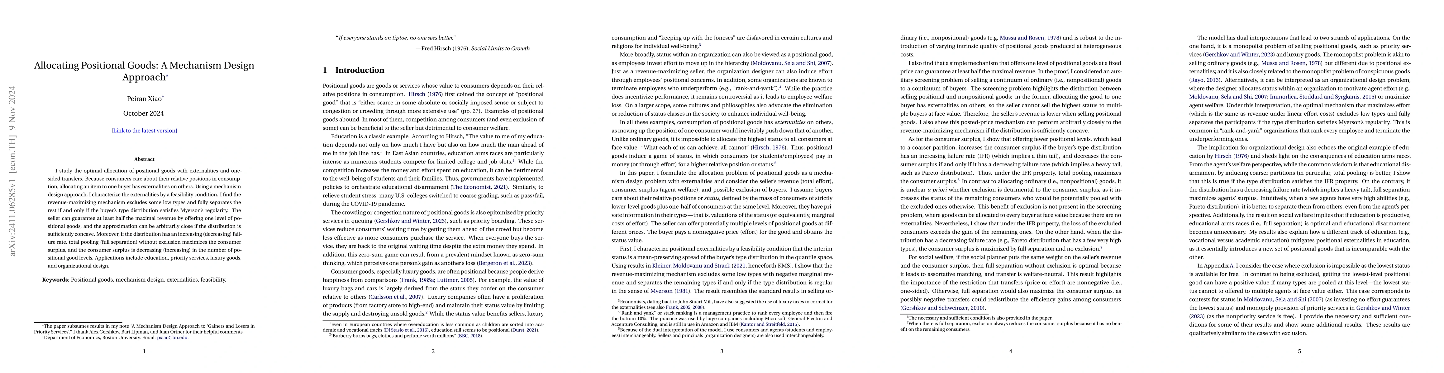 This paper explores the optimal allocation of positional goods through a mechanism design framework, highlighting the externalities of relative consumption positions. It finds that revenue maximization often requires excluding some low-type consumers under specific distribution conditions, and offers insights into maximizing consumer surplus based on the type distribution's characteristics.