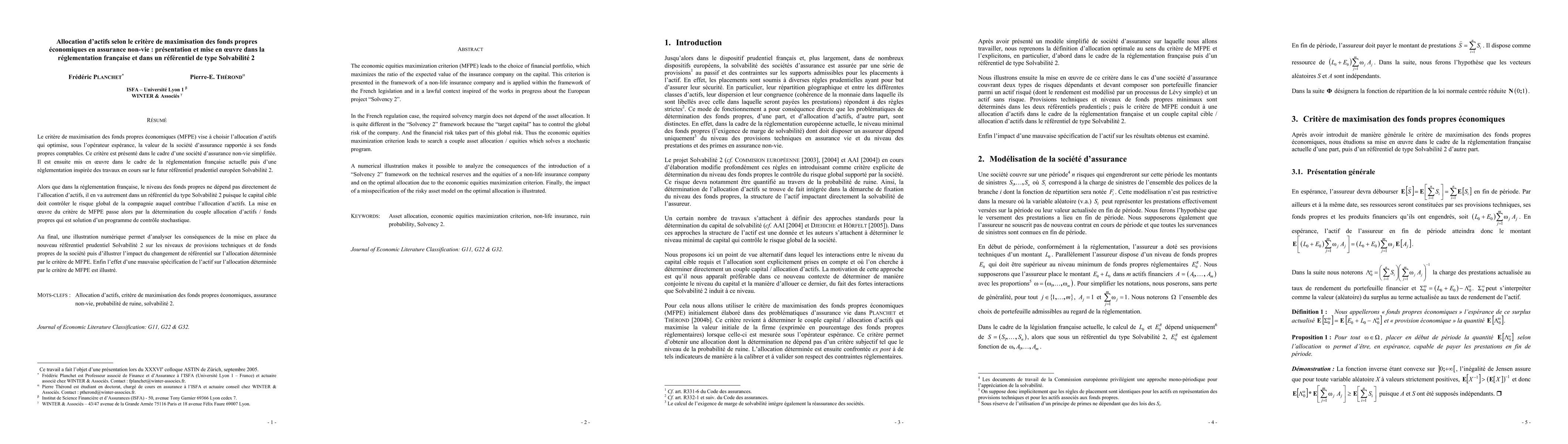 The economic equities maximization criterion (MFPE) leads to the choice of financial portfolio, which maximizes the ratio of the expected value of the insurance company on the capital. This criterion is presented in the framework of a non-life insurance company and is applied within the framework of the French legislation and in a lawful context inspired of the works in progress about the European project Solvency 2. In the French regulation case, the required solvency margin does not depend of the asset allocation. It is quite different in the Solvency 2 framework because the target capital has to control the global risk of the company. And the financial risk takes part of this global risk. Thus the economic equities maximization criterion leads to search a couple asset allocation / equities which solves a stochastic program. A numerical illustration makes it possible to analyze the consequences of the introduction of a Solvency 2 framework on the technical reserves and the equities of a non-life insurance company and on the optimal allocation due to the economic equities maximization criterion. Finally, the impact of a misspecification of the risky asset model on the optimal allocation is illustrated.