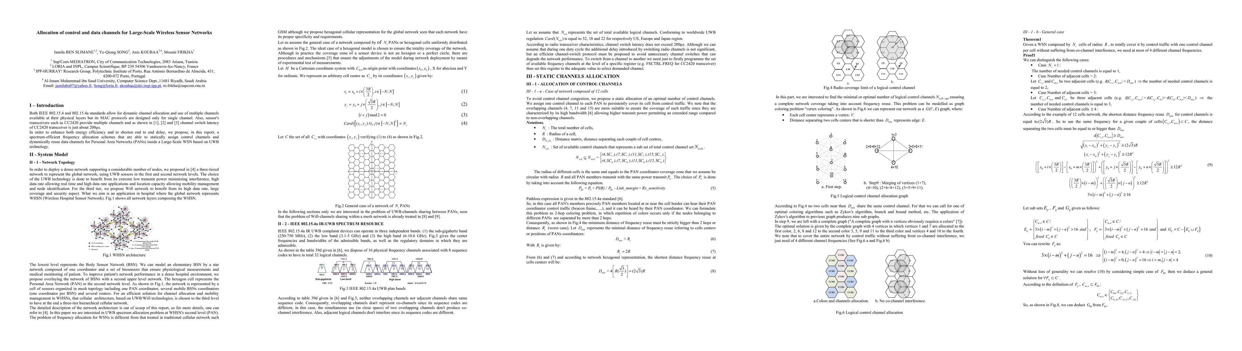 Both IEEE 802.15.4 and 802.15.4a standards allow for dynamic channel allocation and use of multiple channels available at their physical layers but its MAC protocols are designed only for single channel. Also, sensor's transceivers such as CC2420 provide multiple channels and as shown in [1], [2] and [3] channel switch latency of CC2420 transceiver is just about 200$\mu$s. In order to enhance both energy efficiency and to shorten end to end delay, we propose, in this report, a spectrum-efficient frequency allocation schemes that are able to statically assign control channels and dynamically reuse data channels for Personal Area Networks (PANs) inside a Large-Scale WSN based on UWB technology.