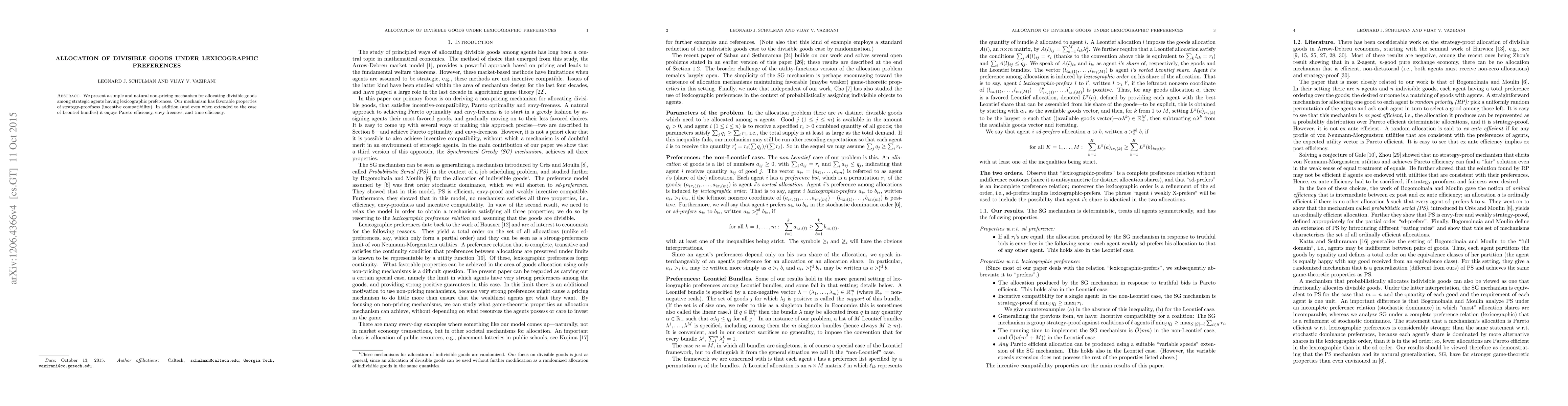 This paper proposes a non-pricing mechanism for allocating divisible goods to agents with lexicographic preferences, achieving incentive compatibility, Pareto efficiency, envy-freeness, and time efficiency. The mechanism is both simple and effective in managing strategic behavior among participants.