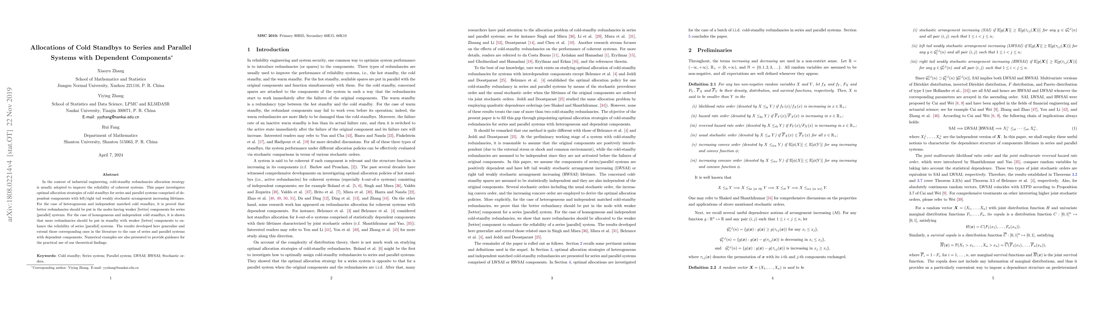 This paper explores optimal allocation strategies for cold standbys in series and parallel systems with dependent components, proving that better redundancies should be placed in nodes with weaker components for series systems and in the standby with weaker components for parallel systems. The findings generalize existing literature and are supplemented with numerical examples for practical application.