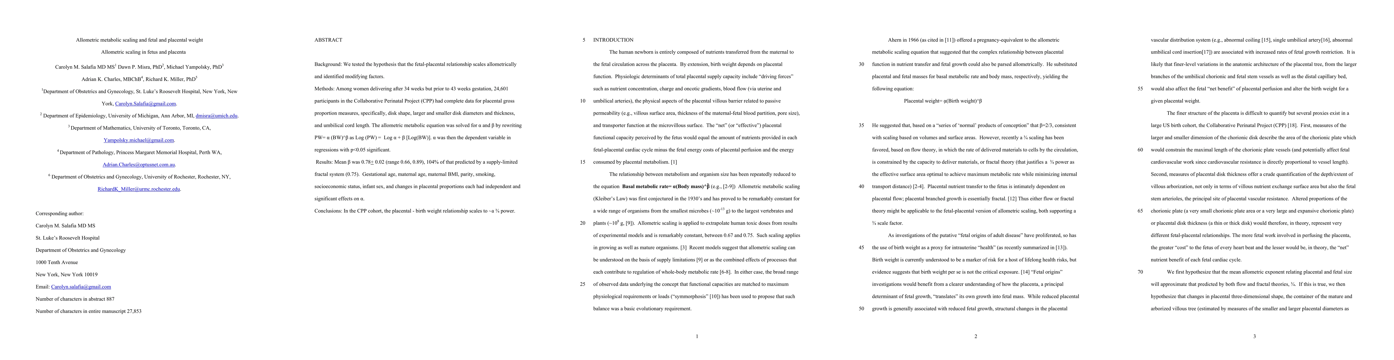 A study of 24,601 pregnancies found that fetal-placental relationships scale allometrically, with the placenta-birth weight relationship scaling to approximately 3/4 power. Gestational age, maternal factors, and socioeconomic status had significant effects on this relationship.