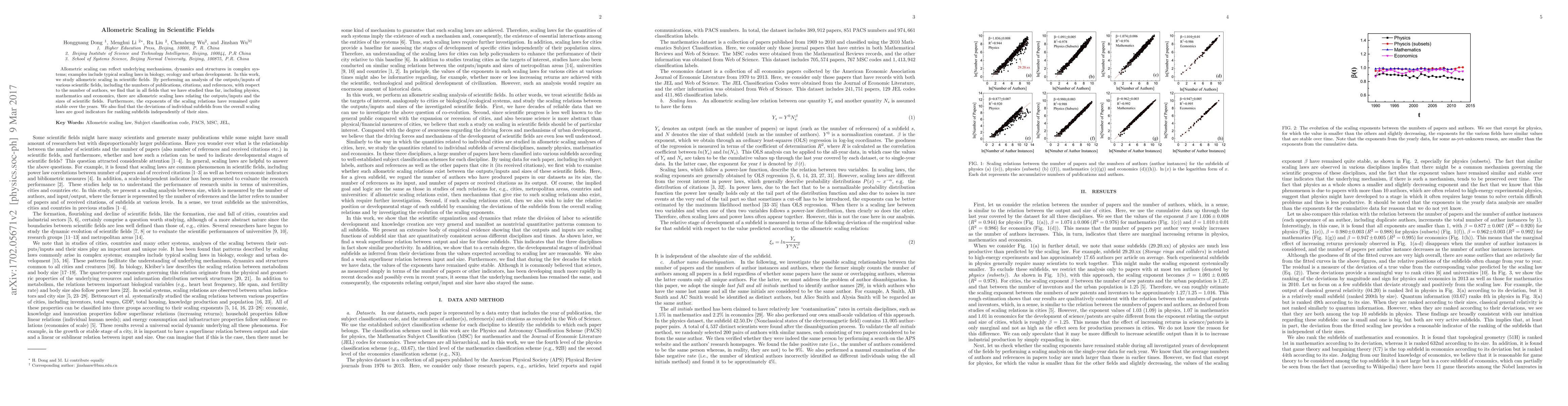 This paper investigates allometric scaling laws across various scientific fields, finding consistent relationships between outputs (publications, citations, references) and inputs (number of authors) that remain stable over time. The study suggests that deviations from these scaling laws can effectively rank subfields irrespective of their size.