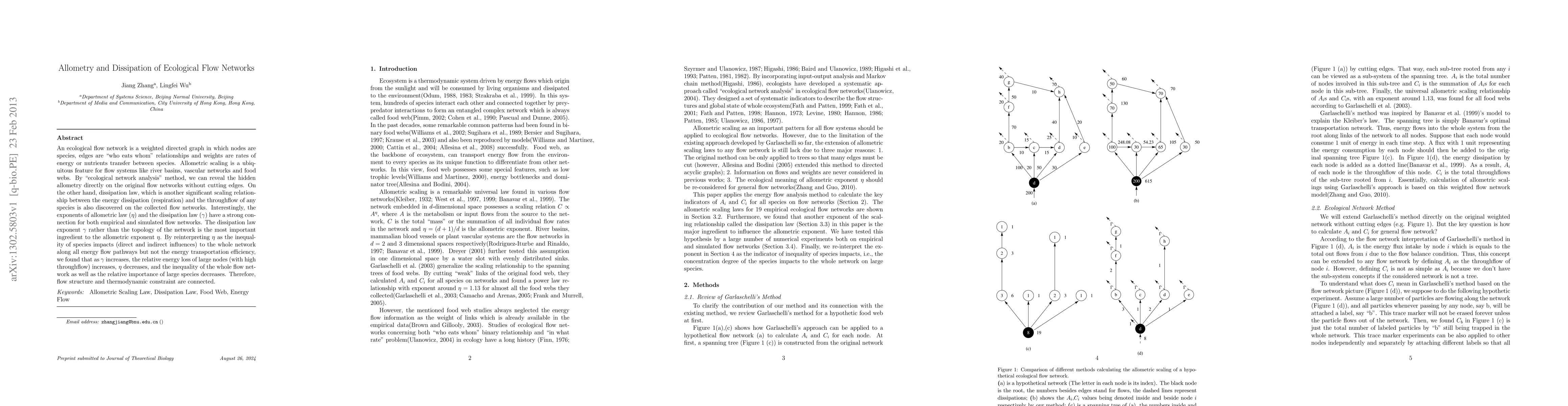 This research reveals that allometric scaling in ecological flow networks, like food webs, is influenced by the dissipation law, which describes energy loss through respiration. The allometric exponent (η) correlates with the dissipation exponent (γ), showing that increased energy loss in larger species (higher γ) decreases the inequality (η) of species impact across the network, linking flow structure with thermodynamic constraints.