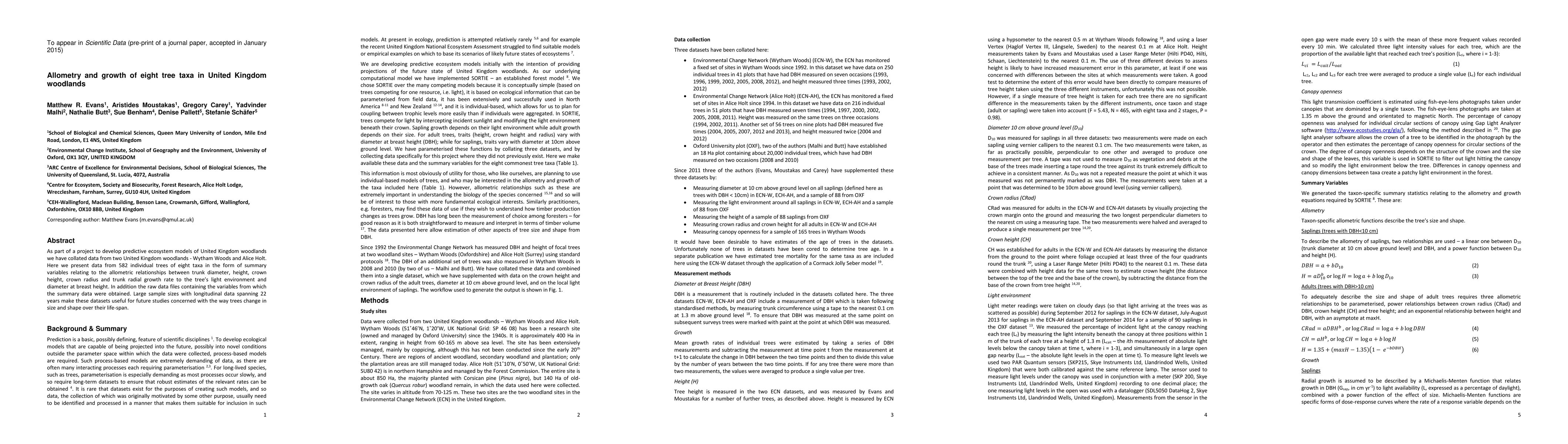 Allometry and growth rates of 8 forest species in the UK. The data were collected from two United Kingdom woodlands - Wytham Woods and Alice Holt. Here we present data from 582 individual trees of eight taxa in the form of summary variables. In addition the raw data files containing the variables from which the summary data were obtained. Large sample sizes with longitudinal data spanning 22 years make these datasets useful for future studies concerned with the way trees change in size and shape over their life-span. The allometric relationships include (1) trunk diameter, (2) height, (3) crown height, (4) crown radius and (5) trunk radial growth rate to (A) the light environment of each tree and (B) diameter at breast height.