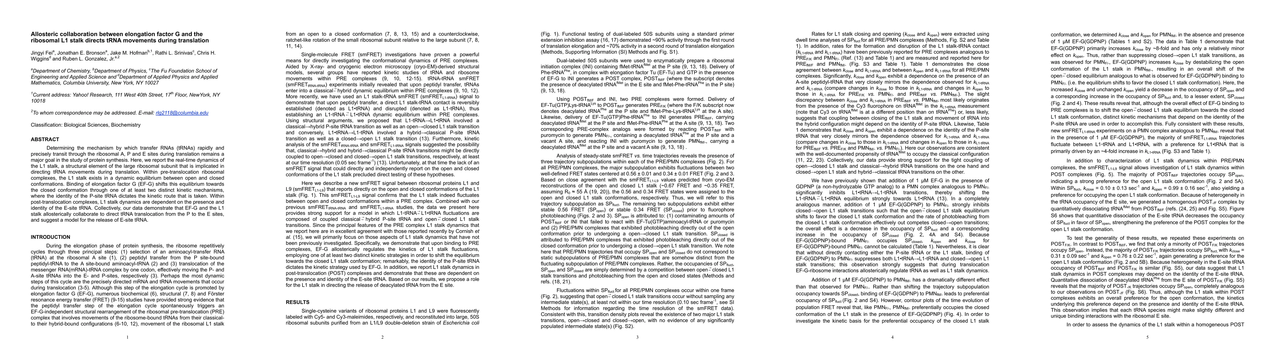 Determining the mechanism by which transfer RNAs (tRNAs) rapidly and precisely transit through the ribosomal A, P and E sites during translation remains a major goal in the study of protein synthesis. Here, we report the real-time dynamics of the L1 stalk, a structural element of the large ribosomal subunit that is implicated in directing tRNA movements during translation. Within pre-translocation ribosomal complexes, the L1 stalk exists in a dynamic equilibrium between open and closed conformations. Binding of elongation factor G (EF-G) shifts this equilibrium towards the closed conformation through one of at least two distinct kinetic mechanisms, where the identity of the P-site tRNA dictates the kinetic route that is taken. Within post-translocation complexes, L1 stalk dynamics are dependent on the presence and identity of the E-site tRNA. Collectively, our data demonstrate that EF-G and the L1 stalk allosterically collaborate to direct tRNA translocation from the P to the E sites, and suggest a model for the release of E-site tRNA.