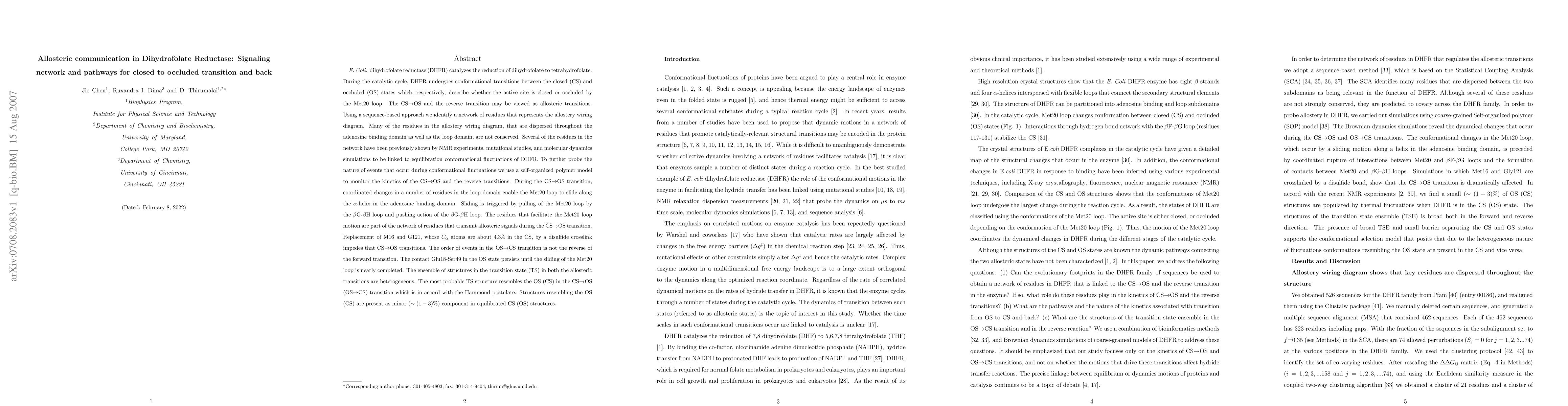 This research identifies a network of residues in E. Coli. dihydrofolate reductase (DHFR) that facilitates allosteric communication during conformational transitions between closed and occluded states. A self-organized polymer model reveals the kinetics of these transitions, highlighting a sliding motion of the Met20 loop that is critical for allosteric signaling.