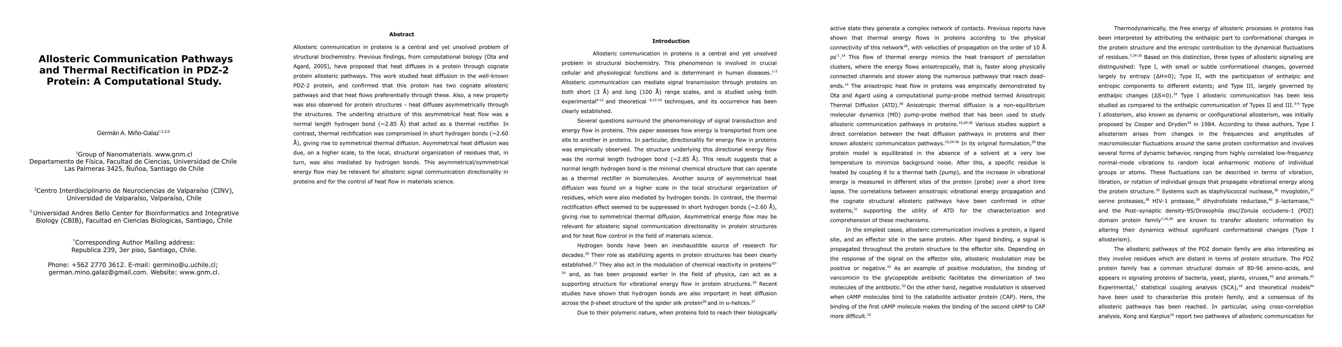 Allosteric communication in proteins is a central and yet unsolved problem of structural biochemistry. Previous findings, from computational biology (Ota and Agard, 2005), have proposed that heat diffuses in a protein through cognate protein allosteric pathways. This work studied heat diffusion in the well-known PDZ-2 protein, and confirmed that this protein has two cognate allosteric pathways and that heat flows preferentially through these. Also, a new property was also observed for protein structures - heat diffuses asymmetrically through the structures. The underling structure of this asymmetrical heat flow was a normal length hydrogen bond (~2.85 {\AA}) that acted as a thermal rectifier. In contrast, thermal rectification was compromised in short hydrogen bonds (~2.60 {\AA}), giving rise to symmetrical thermal diffusion. Asymmetrical heat diffusion was due, on a higher scale, to the local, structural organization of residues that, in turn, was also mediated by hydrogen bonds. This asymmetrical/symmetrical energy flow may be relevant for allosteric signal communication directionality in proteins and for the control of heat flow in materials science.