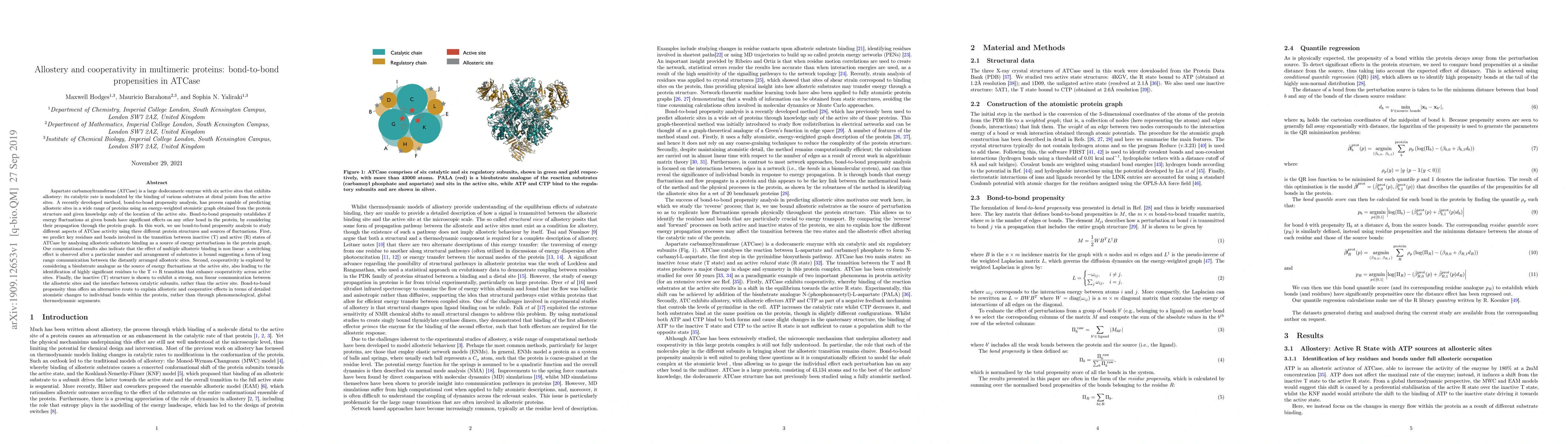 This paper employs bond-to-bond propensity analysis to investigate allosteric modulation and cooperativity in ATCase, revealing key residues and bonds involved in the transition between inactive and active states, and demonstrating non-linear effects of multiple allosteric bindings. It also highlights the cooperative communication between allosteric sites and the protein interface in the inactive state.