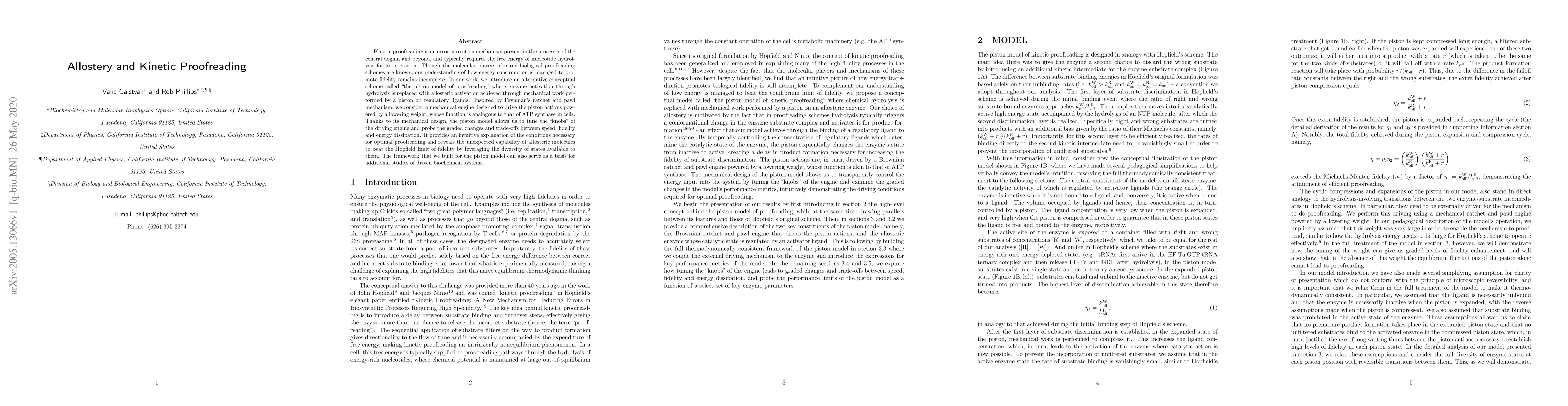 This paper proposes a novel "piston model of proofreading" to explain kinetic proofreading mechanisms using allosteric activation instead of nucleotide hydrolysis. The model demonstrates how mechanical work can optimize error correction, offering insights into the balance between speed, fidelity, and energy dissipation in biological systems.