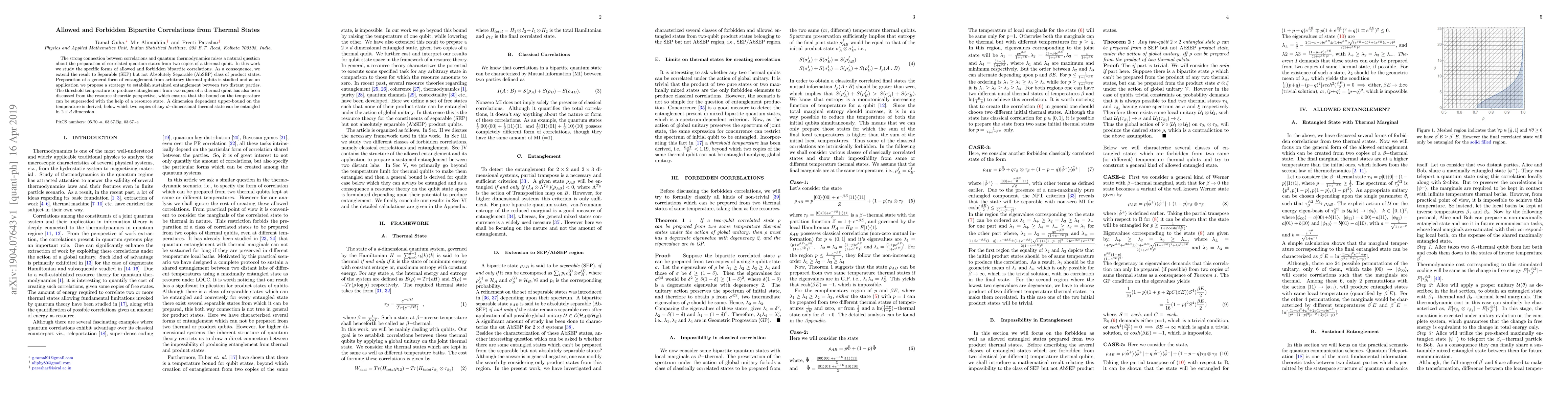 This paper investigates the allowed and forbidden bipartite correlations in thermal qubit states, extending results to the Separable but not Absolutely Separable class. It proposes a method for establishing sustained entanglement between distant parties and derives a dimension-dependent upper-bound on temperature for entanglement generation.