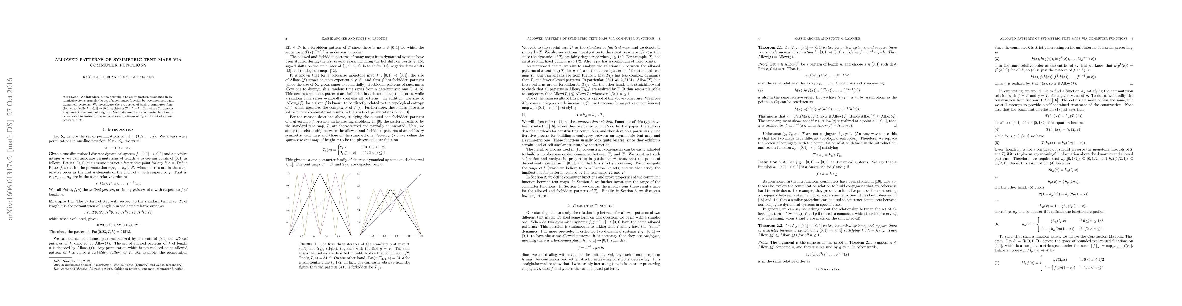 This paper introduces a commuter function technique to study pattern avoidance in dynamical systems, specifically focusing on symmetric tent maps. It proves the strict inclusion of allowed patterns for a given tent map in those of another, using the properties of a function satisfying $T_1 \circ h = h \circ T_\mu$.