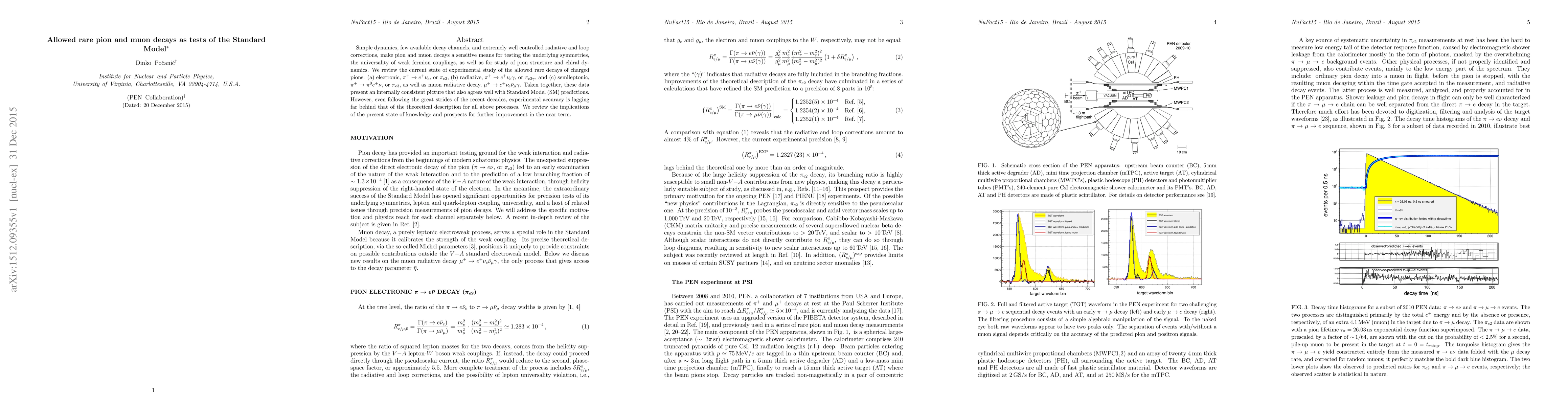 This paper reviews the experimental study of rare pion and muon decays as tests of the Standard Model, finding an internally consistent picture that aligns well with SM predictions. However, it highlights the gap between current experimental accuracy and theoretical precision for these processes.