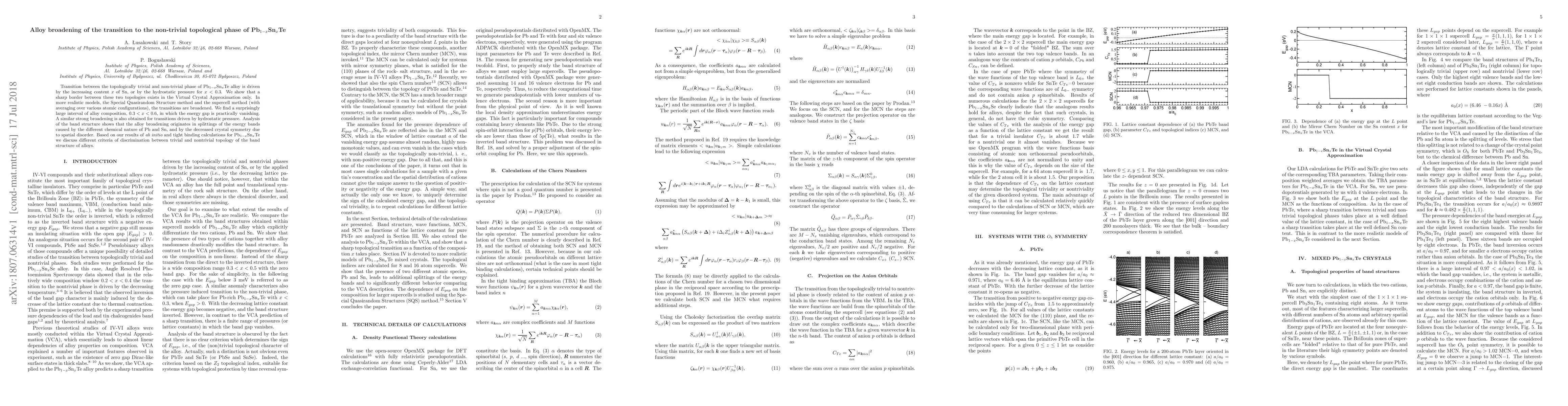 This paper investigates the transition between trivial and non-trivial topological phases in Pb_{1-x}Sn_{x}Te alloys, revealing that the transition is broadened in realistic models due to alloy composition and hydrostatic pressure. The study finds a significant interval where the energy gap is nearly zero, attributing this broadening to the splitting of energy bands caused by the differing chemical nature of Pb and Sn and the reduced crystal symmetry from spatial disorder.