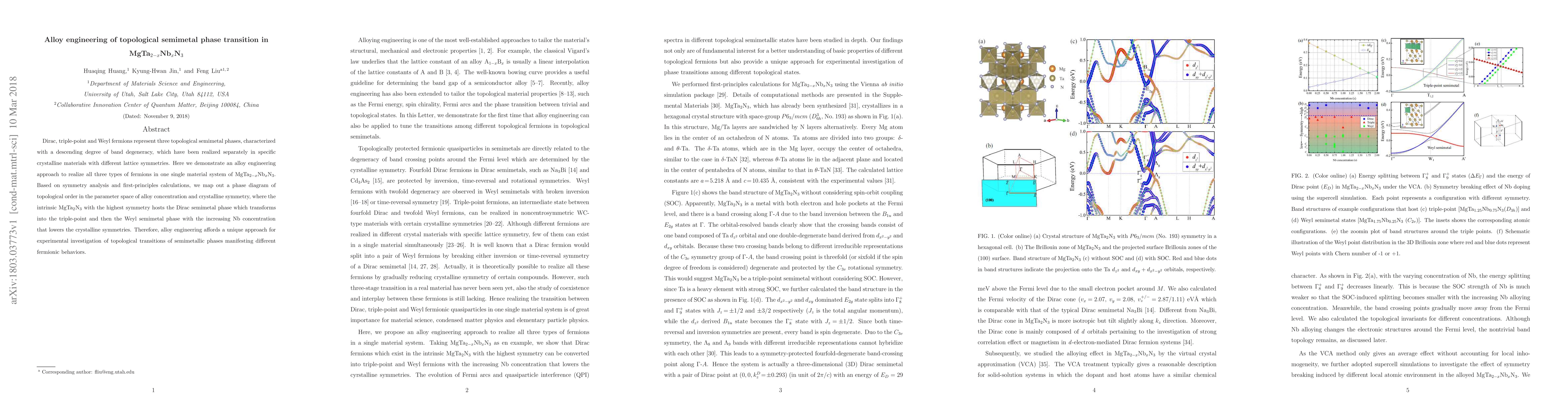 This research paper demonstrates alloy engineering to realize Dirac, triple-point, and Weyl fermions in MgTa$_{2-x}$Nb$_x$N$_3$. Through symmetry analysis and first-principles calculations, the study maps out a phase diagram showing how varying Nb concentration transforms MgTa$_2$N$_3$ from a Dirac to a Weyl semimetal phase, enabling investigation of different topological semimetal behaviors.