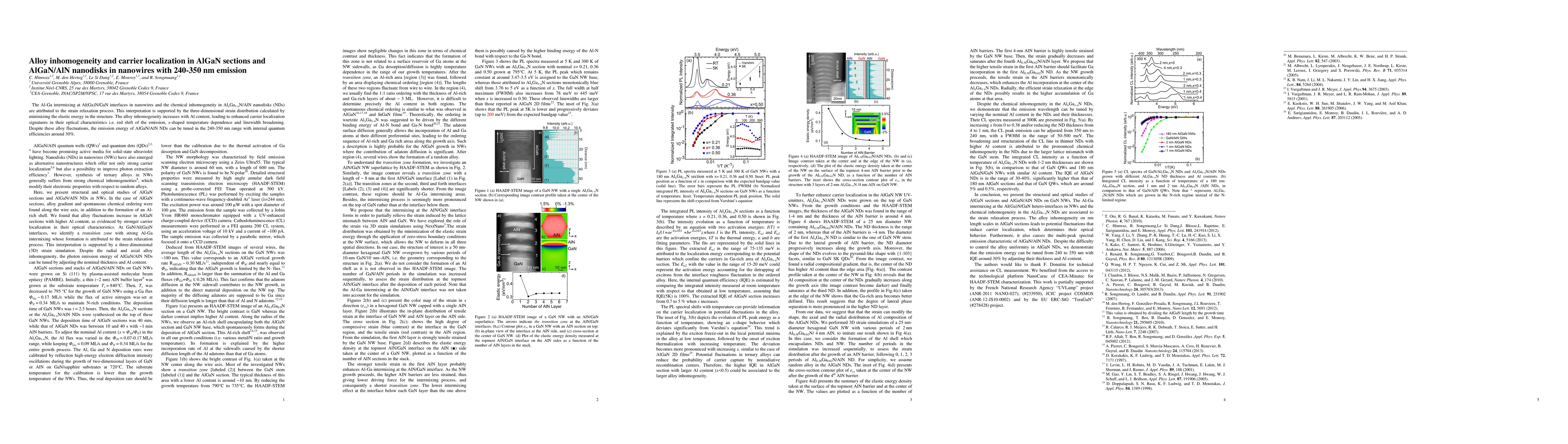 The Al-Ga intermixing at Al(Ga)N/GaN interfaces in nanowires and the chemical inhomogeneity in AlxGa1-xN/AlN nanodisks (NDs) are attributed to the strain relaxation process. This interpretation is supported by the three-dimensional strain distribution calculated by minimizing the elastic energy in the structure. The alloy inhomogeneity increases with Al content, leading to enhanced carrier localization signatures in their optical characteristics i.e. red shift of the emission, s-shaped temperature dependence and linewidth broadening. Despite these alloy fluctuations, the emission energy of AlGaN/AlN NDs can be tuned in the 240-350 nm range with internal quantum efficiencies around 30%.