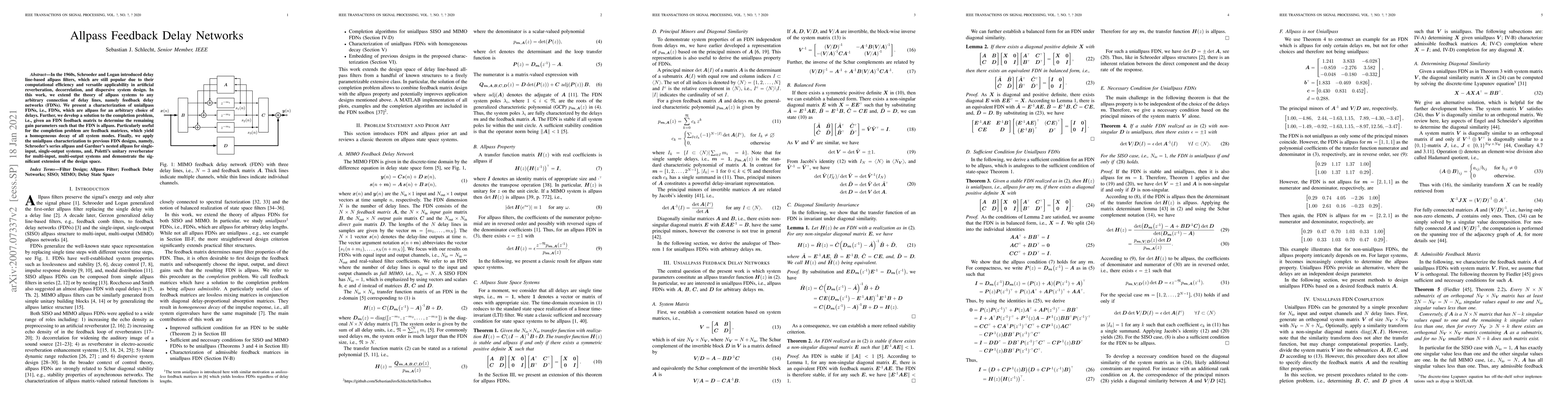 This paper extends the theory of allpass filters to feedback delay networks (FDNs) by characterizing uniallpass FDNs and solving the completion problem to determine gain parameters ensuring allpass properties. It applies these findings to enhance existing FDN designs, significantly expanding their design possibilities.