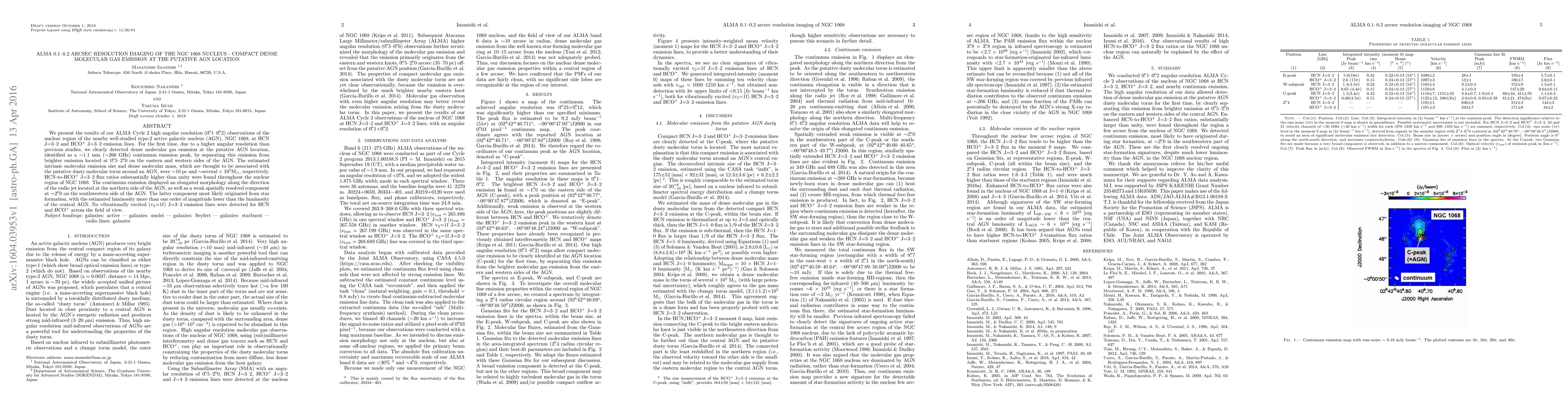 ALMA's high angular resolution observations of NGC 1068 reveal dense molecular gas emission at the AGN location, separated from surrounding regions, indicating a compact, ~10 pc molecular torus with a mass of ~several x 10^5 Msun. Elevated HCN-to-HCO+ ratios suggest enhanced molecular gas activity.
