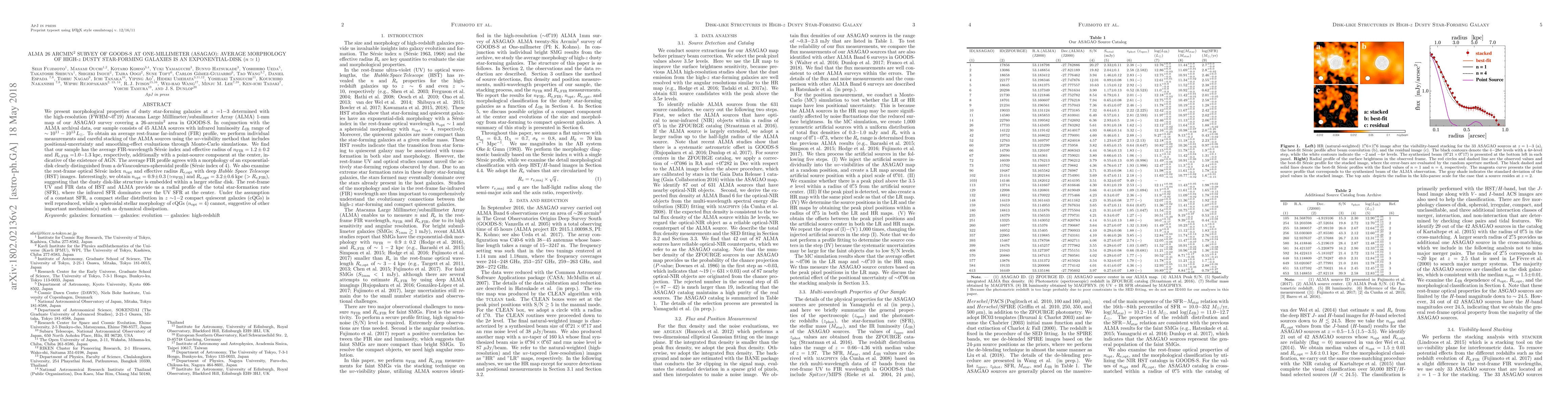The ASAGAO survey using ALMA reveals that high-$z$ dusty star-forming galaxies exhibit an average exponential-disk morphology at FIR wavelengths, with a Sersic index of n_FIR=1.2±0.2 and an effective radius of 1.0-1.3 kpc. The optical disk, observed via HST, is larger with n_opt=0.9±0.3 and R_e,opt=3.2±0.6 kpc.