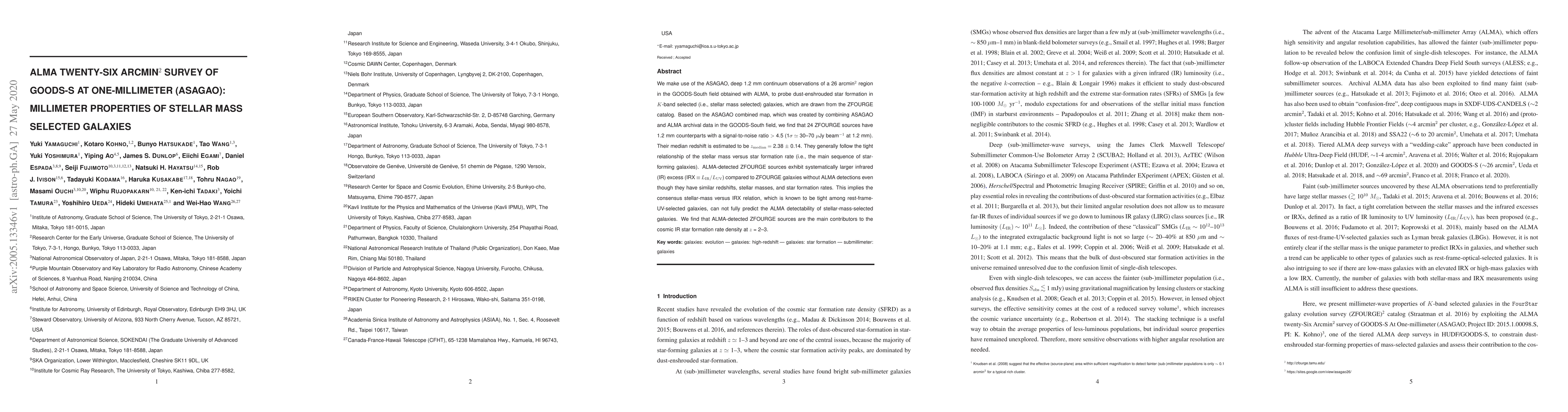 The ASAGAO ALMA survey of GOODS-South reveals that 24 stellar mass-selected galaxies exhibit significant 1.2 mm emission, indicating high dust-enshrouded star formation. These galaxies show a larger infrared excess compared to undetected counterparts, suggesting the existing stellar-mass versus IRX relation may not fully predict ALMA detectability.
