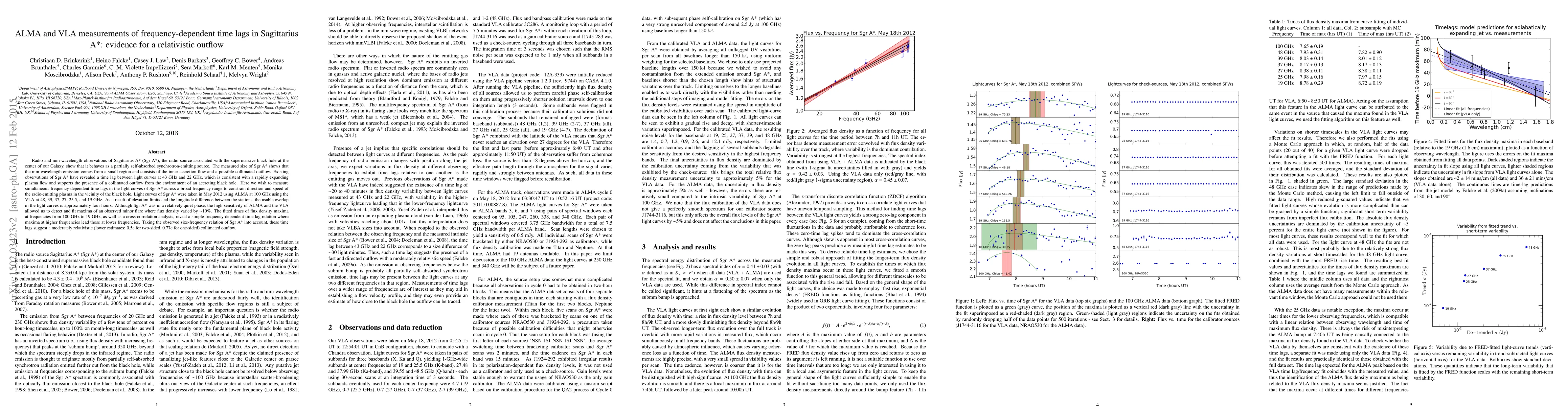 This study uses ALMA and VLA observations to measure frequency-dependent time lags in Sagittarius A*'s light curves, revealing a simple time lag relation where higher frequencies lead lower frequencies. The findings suggest a moderately relativistic collimated outflow emanating from the vicinity of the supermassive black hole.