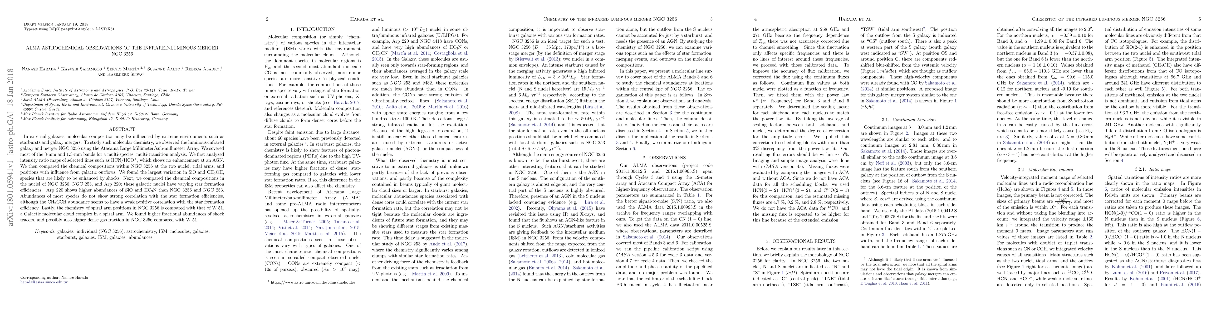 This study uses ALMA to analyze molecular compositions in the infrared-luminous merger NGC 3256, finding significant variations in SiO and CH$_3$OH likely due to shocks. Comparisons with other galactic nuclei show that Arp 220 has higher abundances of shock tracers, suggesting complex relationships between star formation and molecular chemistry.