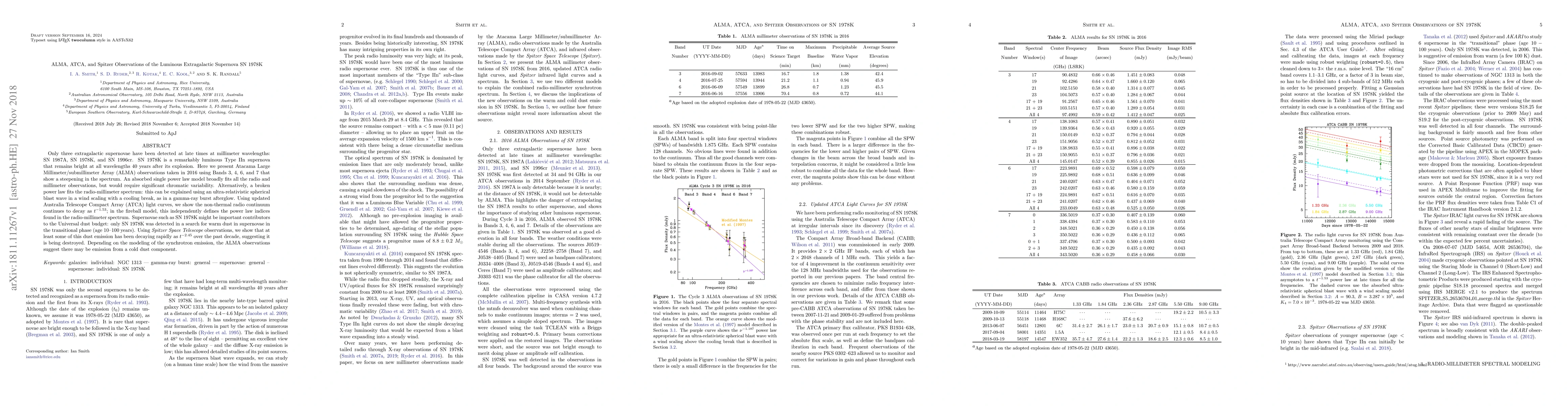 The research presents ALMA, ATCA, and Spitzer observations of the luminous extragalactic supernova SN 1978K, 40 years post-explosion. Key findings include a steepening spectrum in ALMA observations, suggesting either chromatic variability or an ultra-relativistic spherical blast wave. The non-thermal radio continuum decay aligns with a power law index found in the radio-millimeter spectrum. SN 1978K may significantly contribute to the Universal dust budget, but the studied dust appears to be decaying rapidly, possibly due to destruction. The ALMA data hint at a cold dust component depending on synchrotron emission modeling.