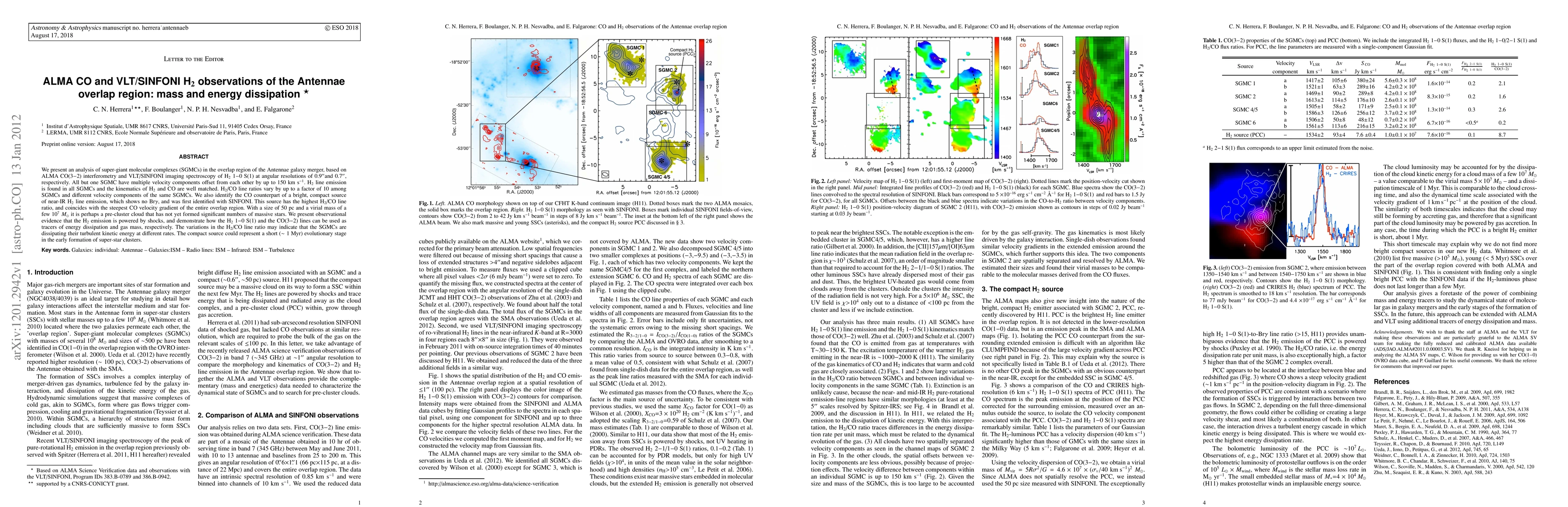 This study uses ALMA and VLT/SINFONI observations to analyze super-giant molecular complexes in the Antennae galaxy merger, finding multiple velocity components and H2 emission in these complexes. The H2/CO line ratios suggest varying rates of energy dissipation among the complexes, with a particularly high ratio source indicating a possible pre-cluster cloud.