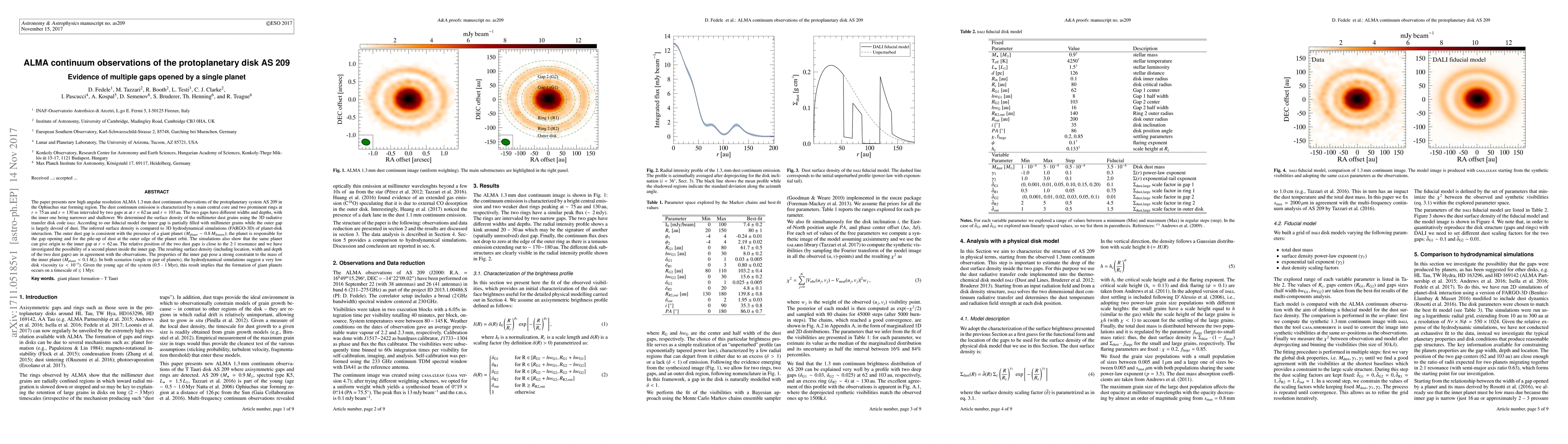 The paper presents new high angular resolution ALMA 1.3 mm dust continuum observations of the protoplanetary system AS 209 in the Ophiuchus star forming region. The dust continuum emission is characterized by a main central core and two prominent rings at $r = 75\,$au and $r = 130\,$au intervaled by two gaps at at $r = 62\,$au and $r = 103\,$au. The two gaps have different widths and depths, with the inner one being narrower and shallower. We determined the surface density of the millimeter dust grains using the 3D radiative transfer disk code \textsc{dali}. According to our fiducial model the inner gap is partially filled with millimeter grains while the outer gap is largely devoid of dust. The inferred surface density is compared to 3D hydrodynamical simulations (FARGO-3D) of planet-disk interaction. The outer dust gap is consistent with the presence of a giant planet ($M_{\rm planet} \sim 0.8\,M_{\rm Staturn}$); the planet is responsible for the gap opening and for the pile-up of dust at the outer edge of the planet orbit. The simulations also show that the same planet can give origin to the inner gap at $r = 62\,$au. The relative position of the two dust gaps is close to the 2:1 resonance and we have investigated the possibility of a second planet inside the inner gap. The resulting surface density (including location, width and depth of the two dust gaps) are in agreement with the observations. The properties of the inner gap pose a strong constraint to the mass of the inner planet ($M_{\rm planet} < 0.1\,M_{\rm J}$). In both scenarios (single or pair of planets), the hydrodynamical simulations suggest a very low disk viscosity ($\alpha < 10^{-4}$). Given the young age of the system (0.5 - 1 Myr), this result implies that the formation of giant planets occurs on a timescale of $\lesssim$ 1\,Myr.