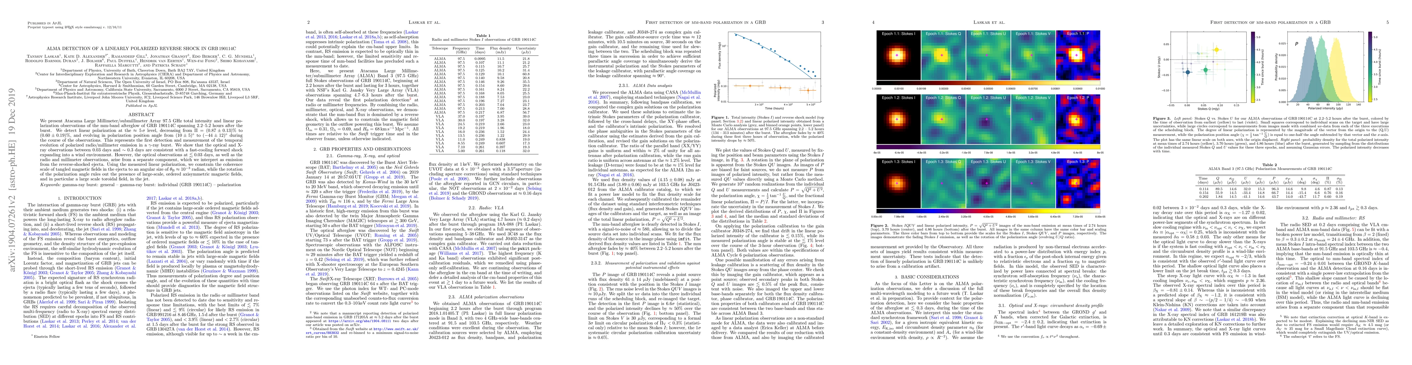 ALMA detected linearly polarized millimeter emission from the afterglow of GRB 190114C, marking the first such observation in a gamma-ray burst. The polarization decreased and rotated, indicating emission from reverse-shocked ejecta and constraining the coherence scale of magnetic fields.