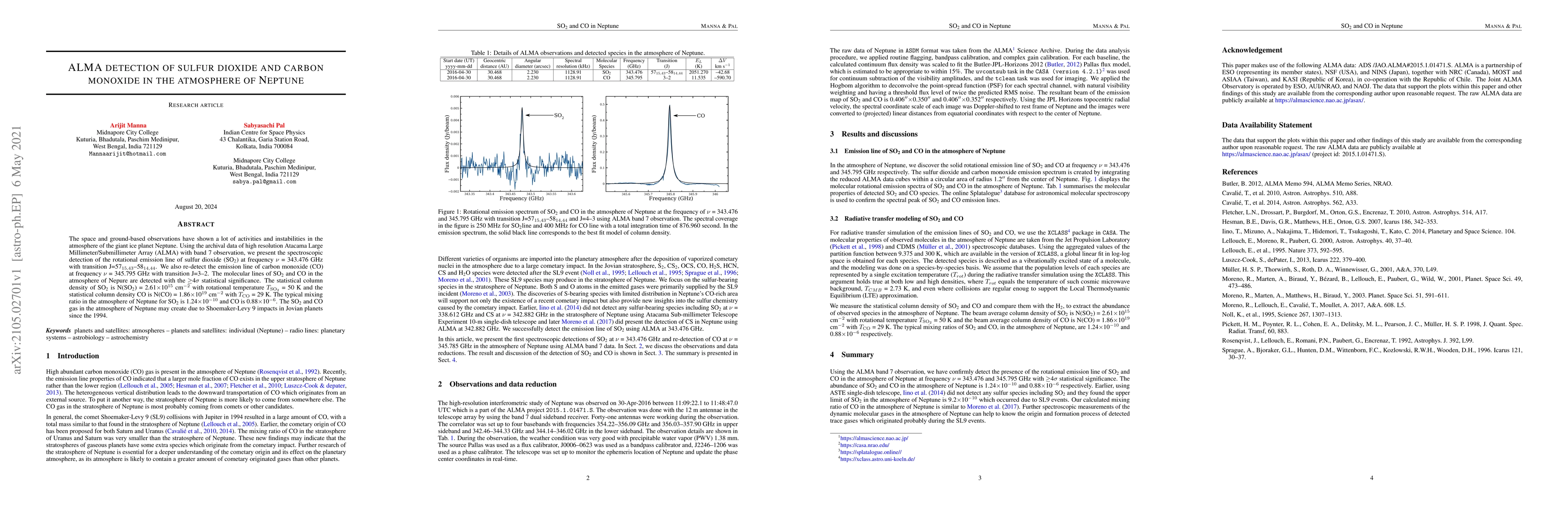 ALMA has detected sulfur dioxide (SO$_{2}$) and carbon monoxide (CO) in Neptune's atmosphere, revealing their rotational emission lines with significant statistical confidence. The findings suggest these gases may be linked to historical impacts like the Shoemaker-Levy 9 collision.