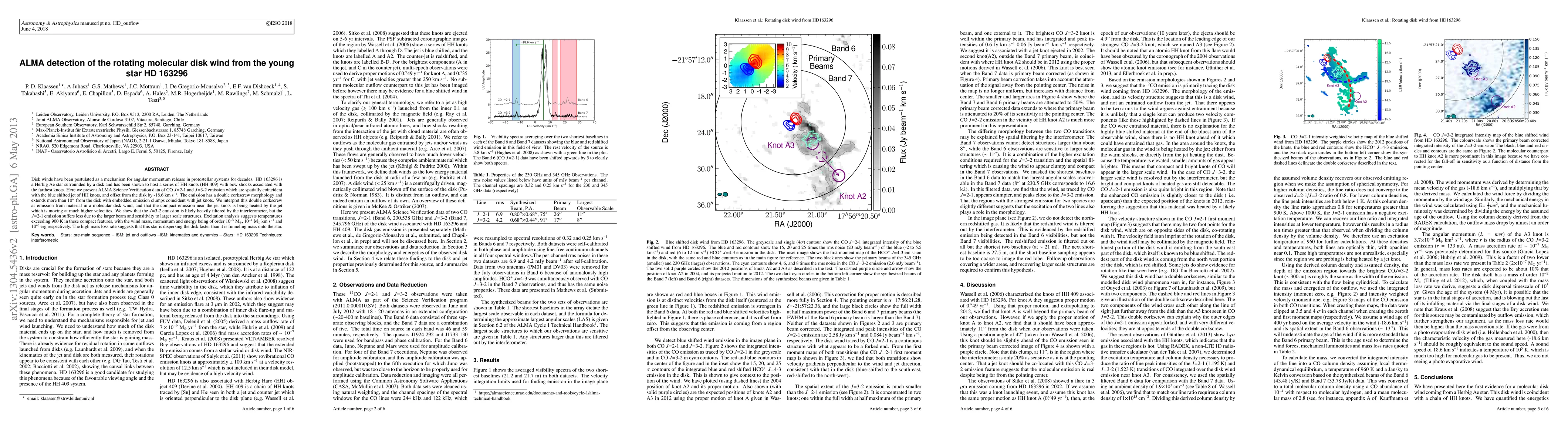 Disk winds have been postulated as a mechanism for angular momentum release in protostellar systems for decades. HD 163296 is a Herbig Ae star surrounded by a disk and has been shown to host a series of HH knots (HH 409) with bow shocks associated with the farthest knots. Here we present ALMA Science Verification data of CO J=2-1 and J=3-2 emission which are spatially coincident with the blue shifted jet of HH knots, and offset from the disk by -18.6 km/s. The emission has a double corkscrew morphology and extends more than 10" from the disk with embedded emission clumps coincident with jet knots. We interpret this double corkscrew as emission from material in a molecular disk wind, and that the compact emission near the jet knots is being heated by the jet which is moving at much higher velocities. We show that the J=3-2 emission is likely heavily filtered by the interferometer, but the J=2-1 emission suffers less due to the larger beam and measurable angular scales. Excitation analysis suggests temperatures exceeding 900 K in these compact features, with the wind mass, momentum and energy being of order 10^{-5} M_sun, 10^{-4} M_sun km/s and 10^{40} erg respectively. The high mass loss rate suggests that this star is dispersing the disk faster than it is funneling mass onto the star.