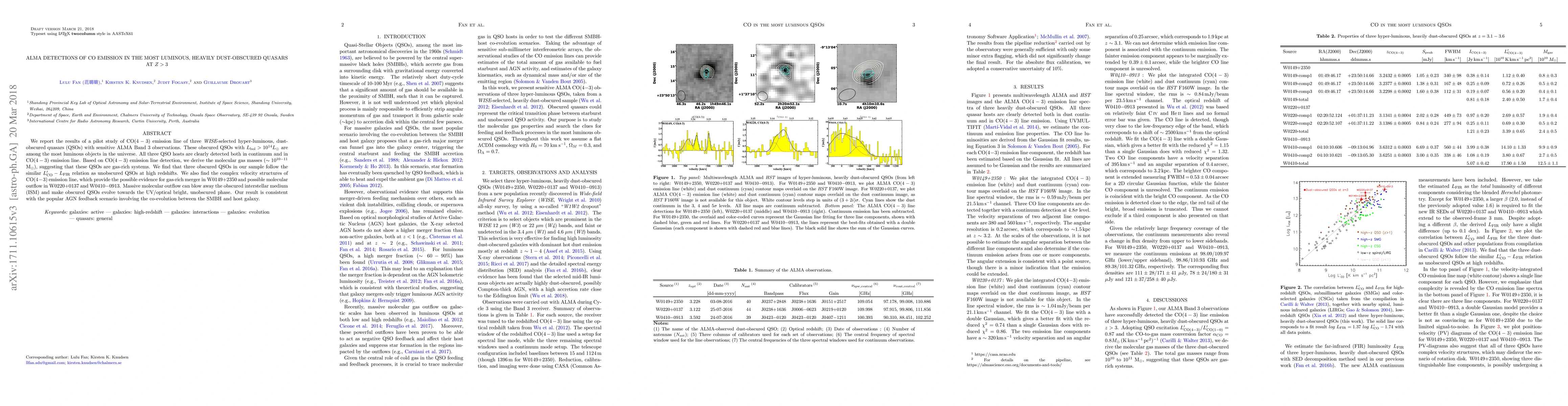 This paper reports ALMA detections of CO emission in three hyper-luminous, dust-obscured quasars at high redshifts, revealing gas masses of around $10^{10-11}$ M$_\odot$ and complex velocity structures indicative of gas-rich mergers and molecular outflows. The findings support the AGN feedback scenario of co-evolution between the supermassive black hole and host galaxy.