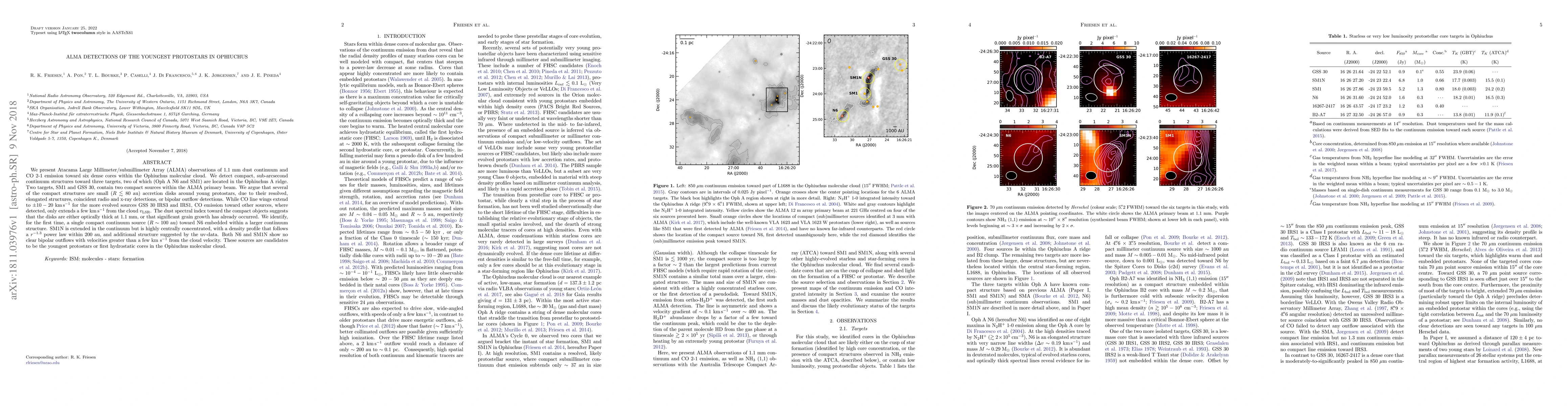 ALMA observations reveal compact, sub-arcsecond continuum structures in the Ophiuchus molecular cloud, likely indicating small accretion disks around young protostars. The youngest candidates, N6 and SM1N, show no significant bipolar outflows, suggesting they are among the earliest stages of star formation.
