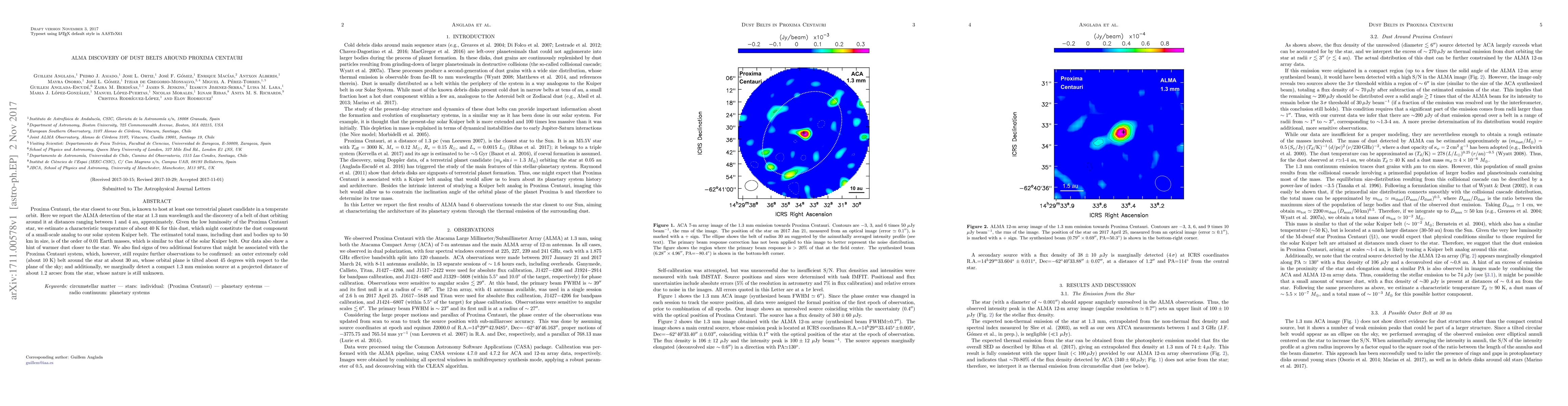 ALMA has detected a dust belt around Proxima Centauri, the nearest star to the Sun, with a temperature of about 40 K, suggesting a small-scale Kuiper belt analog. The belt's total mass, including dust and bodies up to 50 km, is estimated at 0.01 Earth masses.