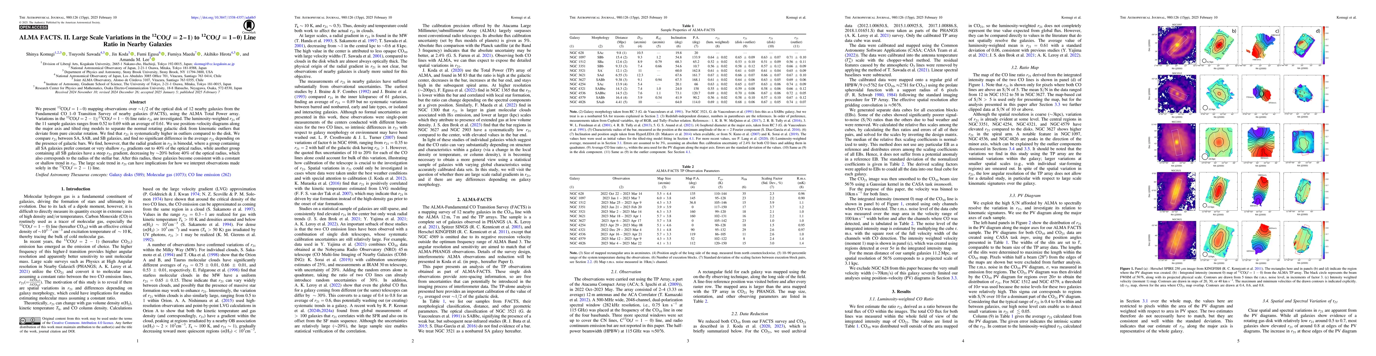 The study utilizes 12CO(J=1-0) mapping observations from the ALMA Total Power array over ~1/2 of the optical disk of 12 nearby galaxies from the FACTS survey to investigate variations in the 12CO(J=2-1)/12CO(J=1-0) line ratio (r21). Position-velocity diagrams and tilted ring models are employed to differentiate between normal disk regions and kinematic outliers.