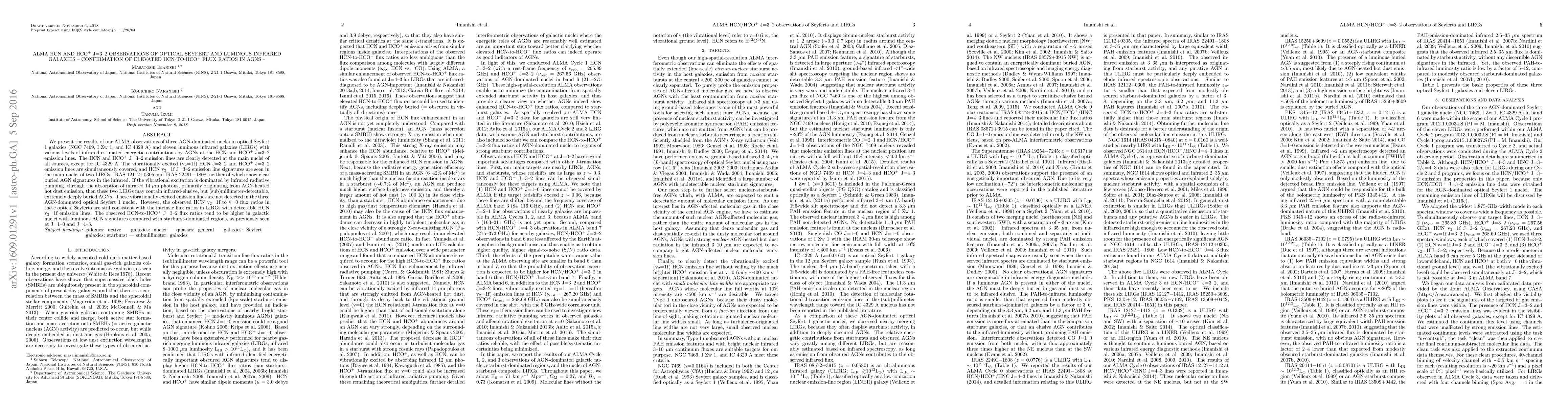 This study using ALMA confirms elevated HCN-to-HCO+ J=3-2 flux ratios in AGN-dominated galaxies compared to starburst regions, indicating a stronger presence of AGN activity. The vibrationally excited HCN lines suggest infrared-elusive AGNs in some LIRGs.