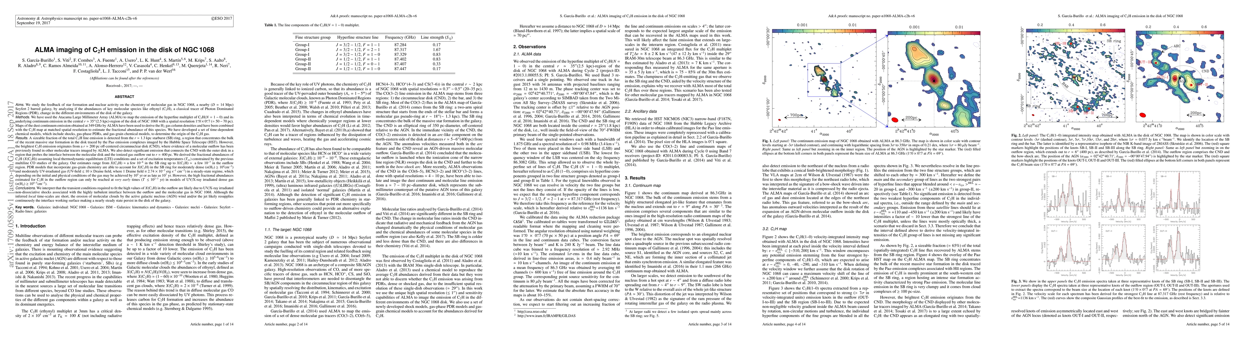 Researchers used ALMA to study C2H emission in NGC1068's disk, finding high abundances of ethynyl gas in a circumnuclear disk and a starburst ring, with models suggesting UV/X-ray irradiation drives the formation.