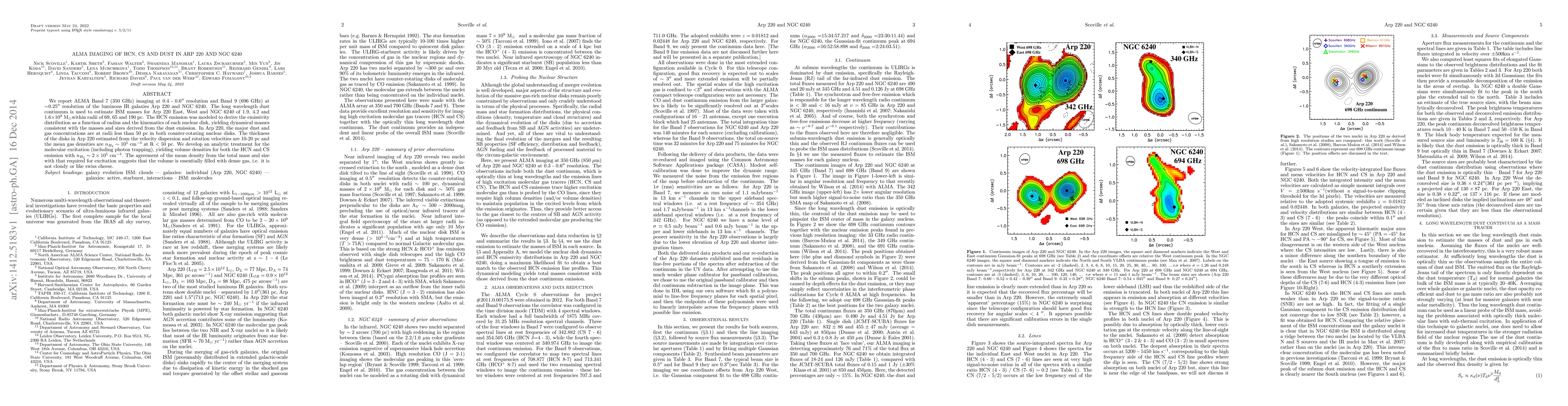 We report ALMA Band 7 (350 GHz) imaging at 0.4 - 0.6arcsec resolution and Band 9 (696 GHz) at ~0.25arcsec resolution of the luminous IR galaxies Arp 220 and NGC 6240. The long wavelength dust continuum is used to estimate ISM masses for Arp 220 East, West and NGC 6240 of 1.9, 4.2 and 1.6x10^9 msun within radii of 69, 65 and 190 pc. The HCN emission was modeled to derive the emissivity distribution as a function of radius and the kinematics of each nuclear disk, yielding dynamical masses consistent with the masses and sizes derived from the dust emission. In Arp 220, the major dust and gas concentrations are at radii less than 50 pc in both counter-rotating nuclear disks. The thickness of the disks in Arp 220estimated from the velocity dispersion and rotation velocities are 10-20 pc and the mean gas densities are n_H2 ~10^5 cm^-3 at R < 50 pc. We develop an analytic treatment for the molecular excitation (including photon trapping), yielding volume densities for both the HCN and CS emission with n_H2 ~2x10^5 cm^-3. The agreement of the mean density from the total mass and size with that required for excitation suggests that the volume is essentially filled with dense gas, i.e. it is not cloudy or like swiss cheese.
