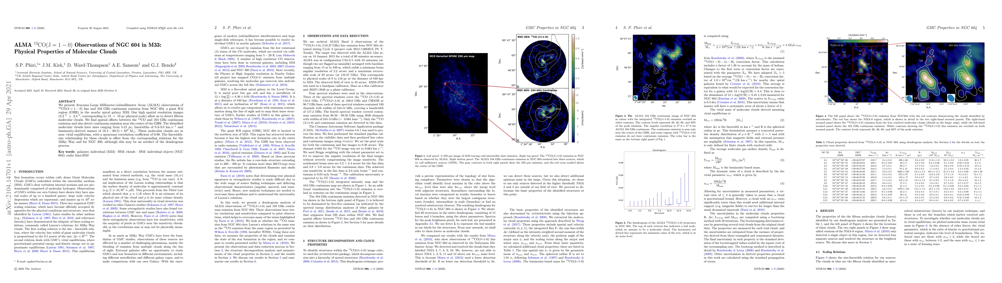 We present Atacama Large Millimeter/submillimeter Array (ALMA) observations of $\mathrm{^{13}CO(J=1-0)}$ line and 104 GHz continuum emission from NGC 604, a giant HII region (GHR) in the nearby spiral galaxy M33. Our high spatial resolution images ( 3.2"$\times$ 2.4", corresponding to $13 \times 10$ pc physical scale) allow us to detect fifteen molecular clouds. We find spatial offsets between the $^{13}CO$ and 104 GHz continuum emission and also detect continuum emission near the centre of the GHR. The identified molecular clouds have sizes ranging from 5-21 pc, linewidths of 0.3-3.0 $\mathrm{kms^{-1}}$ and luminosity-derived masses of (0.4-80.5) $\times 10^3$ M$_{\bigodot}$. These molecular clouds are in near virial equilibrium, with a spearman correlation coefficient of 0.98. The linewidth-size relationship for these clouds is offset from the corresponding relations for the Milky Way and for NGC 300, although this may be an artefact of the dendrogram process.