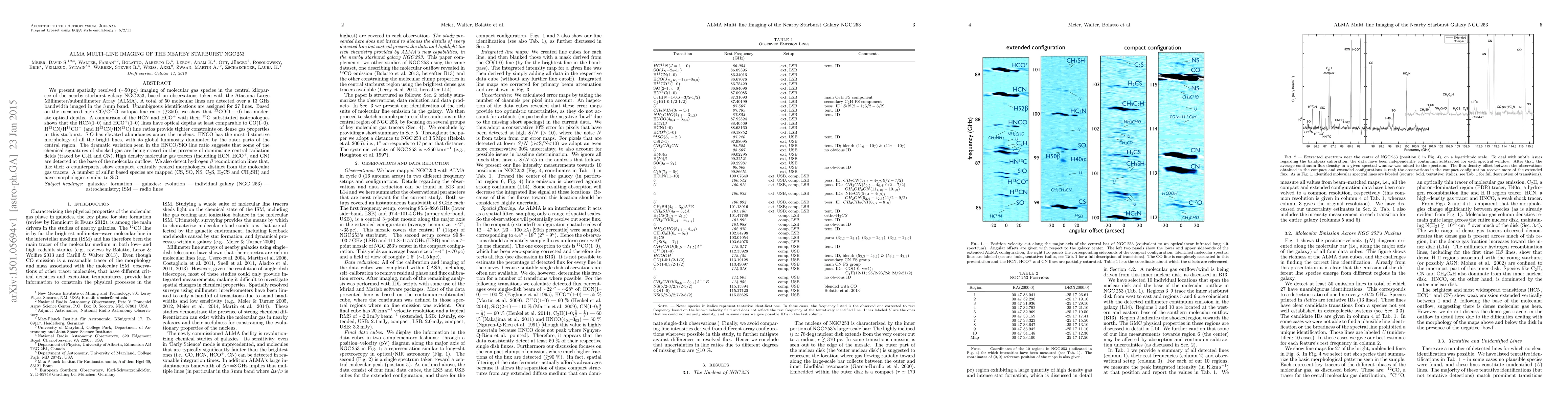 This study uses ALMA to provide high-resolution imaging of molecular gas in the central kiloparsec of NGC 253, detecting 50 molecular lines and identifying 27. The analysis reveals moderate optical depths for $^{12}$CO(1-0) and comparable depths for HCN(1-0) and HCO$^+$(1-0). Elevated SiO abundances and distinctive HNCO morphology suggest chemical variations influenced by central radiation fields.