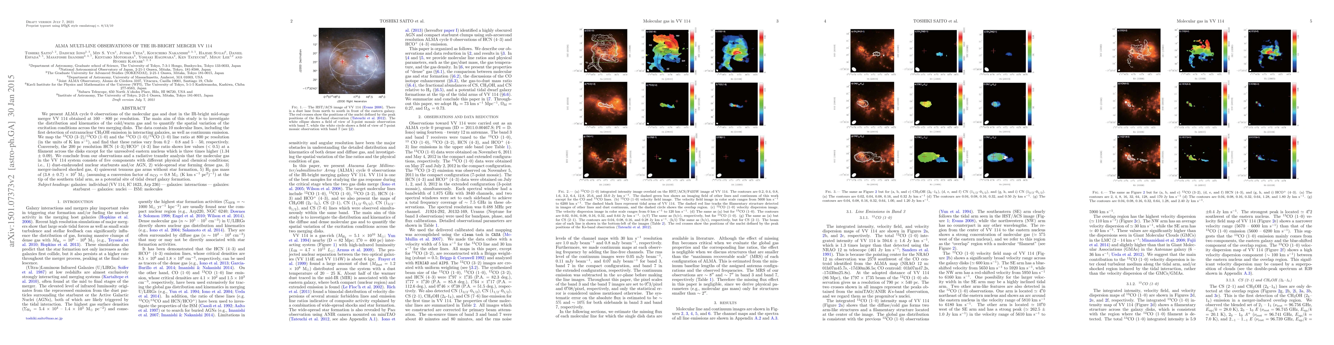 We present ALMA cycle 0 observations of the molecular gas and dust in the IR-bright mid-stage merger VV114 obtained at 160 - 800 pc resolution. The main aim of this study is to investigate the distribution and kinematics of the cold/warm gas and to quantify the spatial variation of the excitation conditions across the two merging disks. The data contain 10 molecular lines, including the first detection of extranuclear CH3OH emission in interacting galaxies, as well as continuum emission. We map the 12CO(3-2)/12CO(1-0) and the 12CO(1-0)/13CO(1-0) line ratio at 800 pc resolution (in the units of K km/s), and find that these ratios vary from 0.2 - 0.8 and 5 - 50, respectively. Conversely, the 200 pc resolution HCN(4-3)/HCO+(4-3) line ratio shows low values (< 0.5) at a filament across the disks except for the unresolved eastern nucleus which is three times higher (1.34 +/- 0.09). We conclude from our observations and a radiative transfer analysis that the molecular gas in the VV114 system consists of five components with different physical and chemical conditions; i.e., 1) dust-enshrouded nuclear starbursts and/or AGN, 2) wide-spread star forming dense gas, 3) merger-induced shocked gas, 4) quiescent tenuous gas arms without star formation, 5) H2 gas mass of (3.8 +/- 0.7) * 10^7 Msun (assuming a conversion factor of {\alpha}_CO = 0.8 Msun (K km s^-1 pc^2)^-1) at the tip of the southern tidal arm, as a potential site of tidal dwarf galaxy formation.