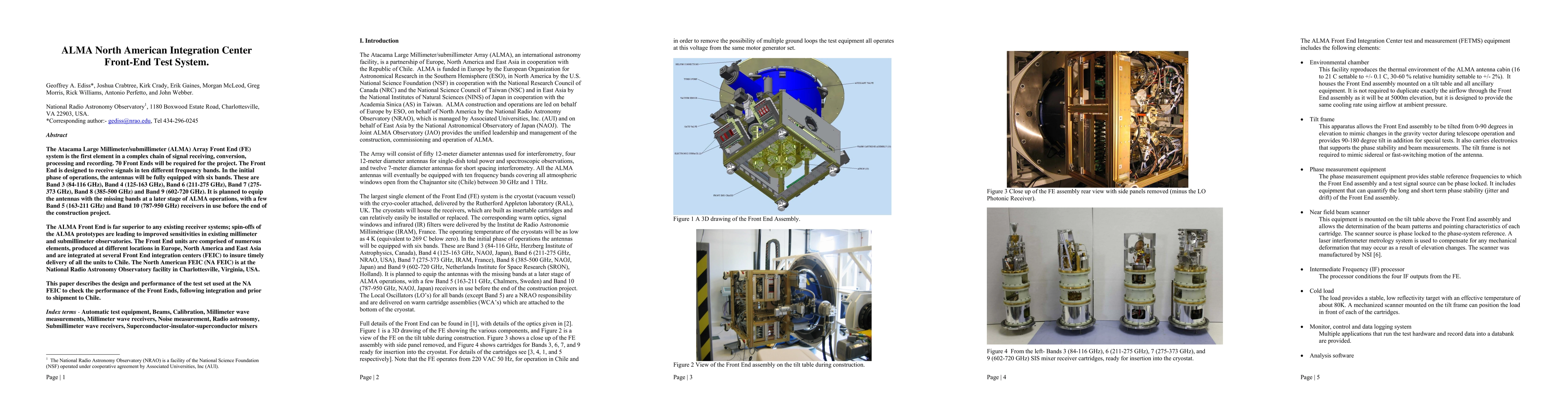 This paper details the design and performance of the test system at the North American Front End Integration Center for the ALMA Array, which verifies the functionality of the Front End units before they are shipped to Chile. The Front End system is superior to existing receivers and integrates components from various global locations.