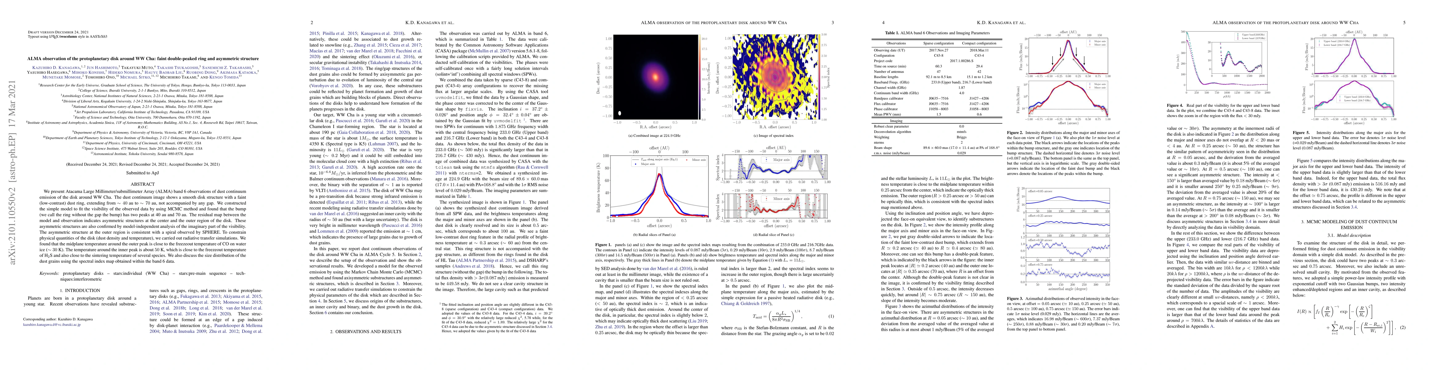 We present Atacama Large Millimeter/submillimeter Array (ALMA) Band 6 observations of dust continuum emission of the disk around WW Cha. The dust continuum image shows a smooth disk structure with a faint (low-contrast) dust ring, extending from $\sim 40$ au to $\sim 70$ au, not accompanied by any gap. We constructed the simple model to fit the visibility of the observed data by using MCMC method and found that the bump (we call the ring without the gap the bump) has two peaks at $40$ au and $70$ au. The residual map between the model and observation indicates asymmetric structures at the center and the outer region of the disk. These asymmetric structures are also confirmed by model-independent analysis of the imaginary part of the visibility. The asymmetric structure at the outer region is consistent with a spiral observed by SPHERE. To constrain physical quantities of the disk (dust density and temperature), we carried out radiative transfer simulations. We found that the midplane temperature around the outer peak is close to the freezeout temperature of CO on water ice ($\sim 30$ K). The temperature around the inner peak is about $50$ K, which is close to the freezeout temperature of H$_2$S and also close to the sintering temperature of several species. We also discuss the size distribution of the dust grains using the spectral index map obtained within the Band 6 data.