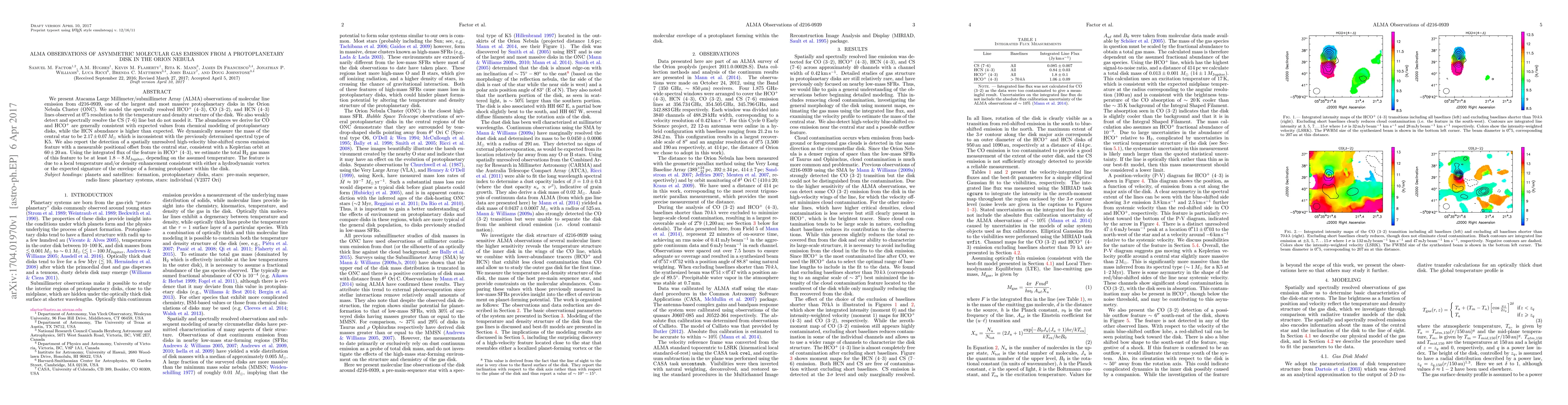 ALMA observations reveal asymmetric molecular gas emission from the protoplanetary disk d216-0939 in the Orion Nebula, suggesting a high-velocity blue-shifted feature consistent with a Keplerian orbit. The feature's mass is estimated to be at least 1.8-8 Jupiter masses, hinting at a possible protoplanetary envelope or hydrodynamic vortex.