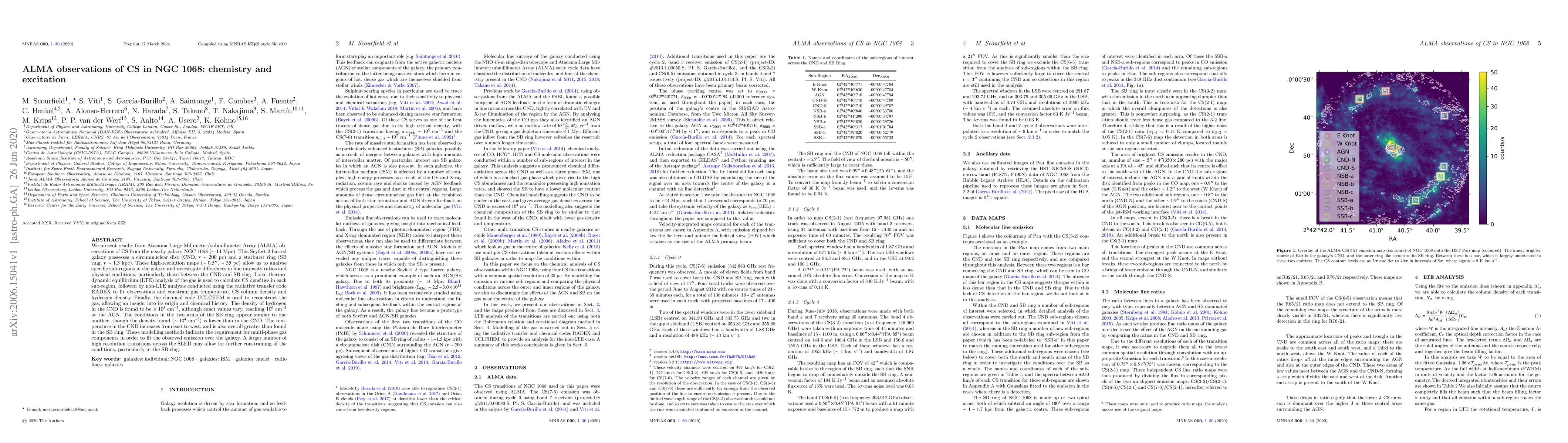 We present results from Atacama Large Millimeter/submillimeter Array (ALMA) observations of CS from the nearby galaxy NGC 1068 ($\sim14$ Mpc). This Seyfert 2 barred galaxy possesses a circumnuclear disc (CND, $r\sim200$ pc) and a starburst ring (SB ring, $r\sim1.3$ kpc). These high-resolution maps ($\sim0.5$", $\sim35$ pc) allow us to analyse specific sub-regions in the galaxy and investigate differences in line intensity ratios and physical conditions, particularly those between the CND and SB ring. Local thermodynamic equilibrium (LTE) analysis of the gas is used to calculate CS densities in each sub-region, followed by non-LTE analysis conducted using the radiative transfer code RADEX to fit observations and constrain gas temperature, CS column density and hydrogen density. Finally, the chemical code UCLCHEM is used to reconstruct the gas, allowing an insight into its origin and chemical history. The density of hydrogen in the CND is found to be $\geq10^5$ cm$^{-2}$, although exact values vary, reaching $10^6$ cm$^{-2}$ at the AGN. The conditions in the two arms of the SB ring appear similar to one another, though the density found ($\sim10^4$ cm$^{-2}$) is lower than in the CND. The temperature in the CND increases from east to west, and is also overall greater than found in the SB ring. These modelling methods indicate the requirement for multi-phase gas components in order to fit the observed emission over the galaxy. A larger number of high resolution transitions across the SLED may allow for further constraining of the conditions, particularly in the SB ring.
