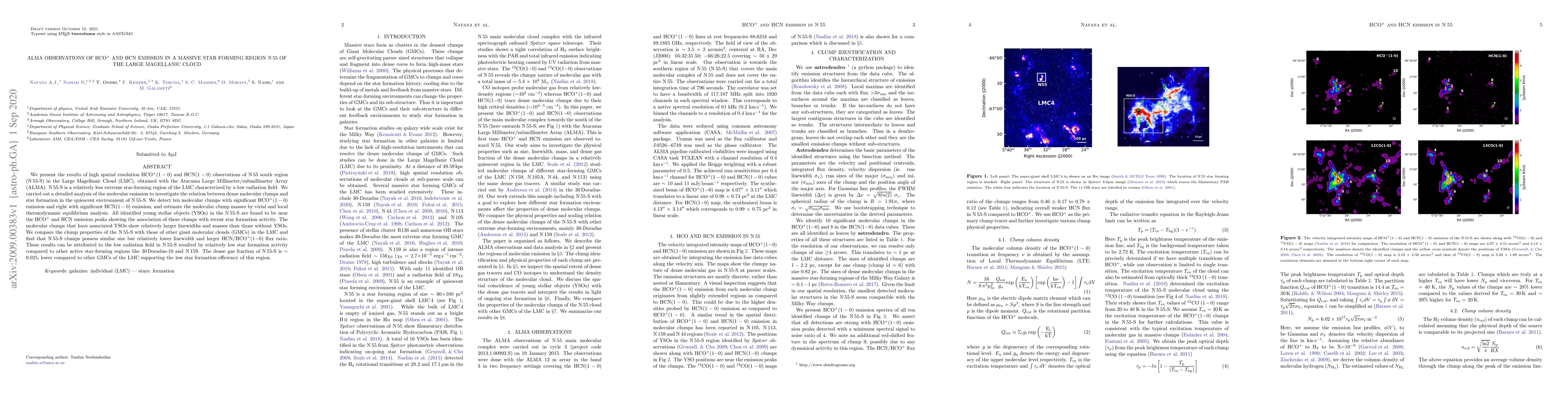 This study uses ALMA to analyze HCO+ and HCN emissions in the N55-S region of the Large Magellanic Cloud, revealing a connection between dense molecular clumps and recent star formation. The low radiation field in N55-S results in lower star formation efficiency compared to more active regions, evidenced by lower linewidths and higher HCN/HCO+ ratios in the molecular clumps.
