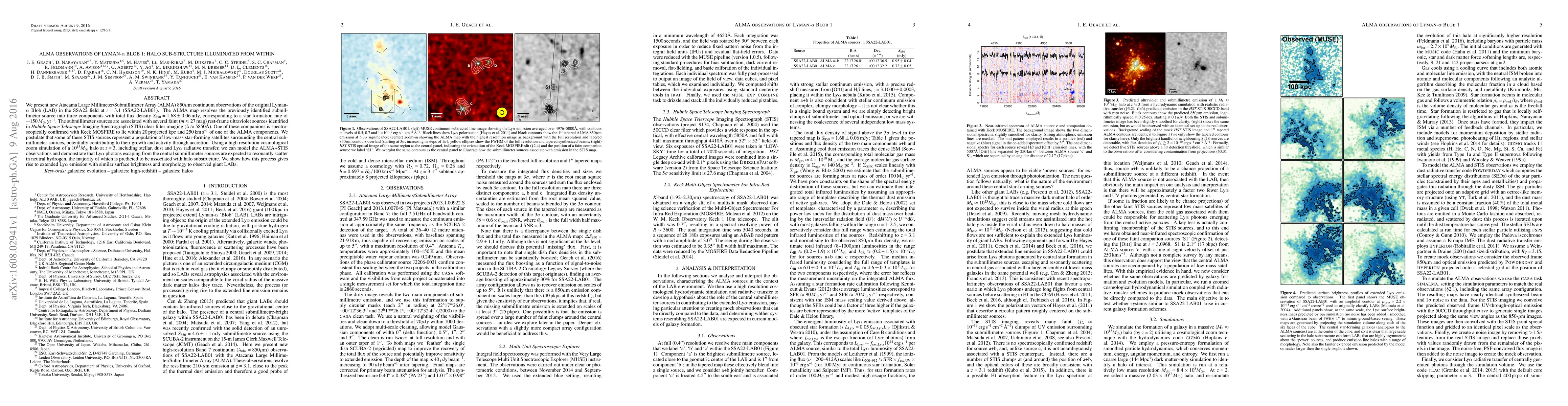 We present new Atacama Large Millimeter/Submillimeter Array (ALMA) 850um continuum observations of the original Lyman-alpha Blob (LAB) in the SSA22 field at z=3.1 (SSA22-LAB01). The ALMA map resolves the previously identified submillimeter source into three components with total flux density S_850 = 1.68+/-0.06 mJy, corresponding to a star formation rate of ~150 M_sun/yr. The submillimeter sources are associated with several faint (m~27 mag) rest-frame ultraviolet sources identified in Hubble Space Telescope Imaging Spectrograph (STIS) clear filter imaging (~5850A). One of these companions is spectroscopically confirmed with Keck MOSFIRE to lie within 20 projected kpc and 250 km/s of one of the ALMA components. We postulate that some of these STIS sources represent a population of low-mass star-forming satellites surrounding the central submillimeter sources, potentially contributing to their growth and activity through accretion. Using a high resolution cosmological zoom simulation of a 10^13 M_sun halo at z=3, including stellar, dust and Ly-alpha radiative transfer, we can model the ALMA+STIS observations and demonstrate that Ly-alpha photons escaping from the central submillimeter sources are expected to resonantly scatter in neutral hydrogen, the majority of which is predicted to be associated with halo substructure. We show how this process gives rise to extended Ly-alpha emission with similar surface brightness and morphology to observed giant LABs.