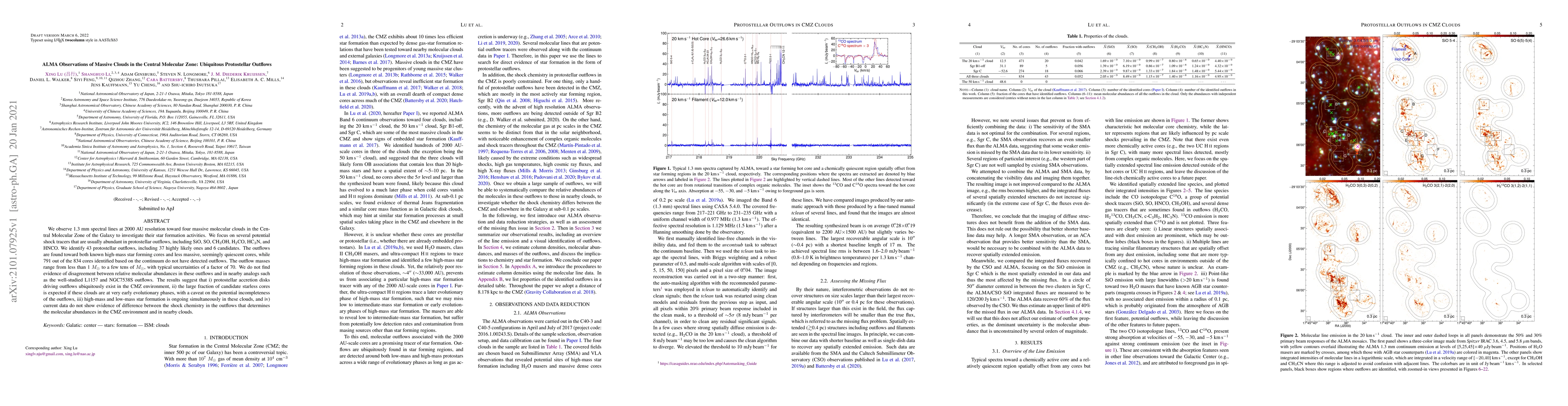 ALMA observations reveal 43 protostellar outflows in the Central Molecular Zone, indicating ubiquitous star formation activity across massive clouds. The study finds simultaneous high-mass and low-mass star formation, with no significant differences in shock chemistry compared to nearby regions.