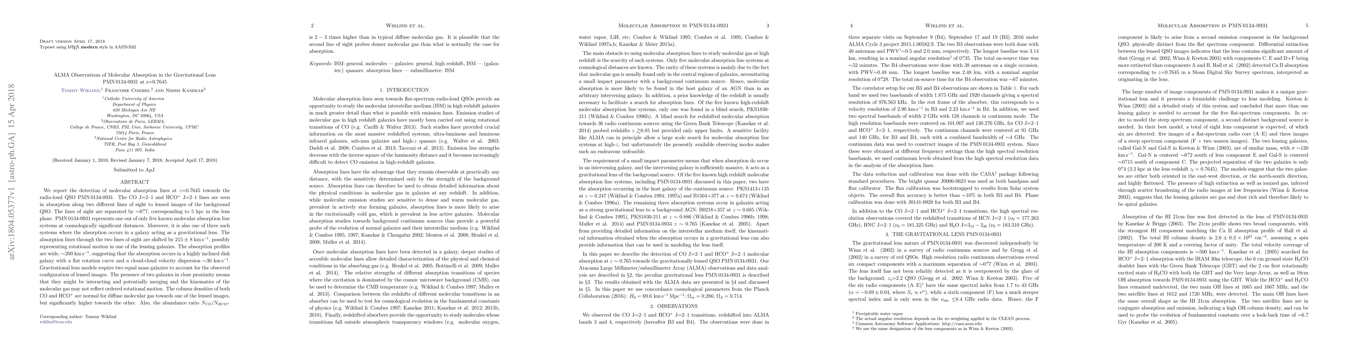 We report the detection of molecular absorption lines at z=0.7645 towards the radio-loud QSO PMN 0134-0931. The CO J=2-1 and HCO+ J=2-1 lines are seen in absorption along two different lines of sight to lensed images of the background QSO. The lines of sight are separated by ~0.7", corresponding to 5 kpc in the lens plane. PMN 0134-0931 represents one out of only five known molecular absorption line systems at cosmologically significant distances. Moreover, it is also one of three such systems where the absorption occurs in a galaxy acting as a gravitational lens. The absorption lines through the two lines of sight are shifted by 215+/-8 km/s, possibly representing rotational motion in one of the lensing galaxies. The absorption profiles are wide, ~200 km/s, suggesting that the absorption occurs in a highly inclined disk galaxy with a flat rotation curve and a cloud-cloud velocity dispersion ~30 km/s. Gravitational lens models require two equal mass galaxies to account for the observed configuration of lensed images. The presence of two galaxies in close proximity means that they might be interacting and potentially merging and the kinematics of the molecular gas may not reflect ordered rotational motion. The column densities of both CO and HCO+ are normal for diffuse molecular gas towards one of the lensed images, but significantly higher towards the other. Also, the abundance ratio N(CO)/N(HCO+) is 2-3 times higher than in typical diffuse molecular gas. It is plausible that the second line of sight probes denser molecular gas than what is normally the case for absorption.